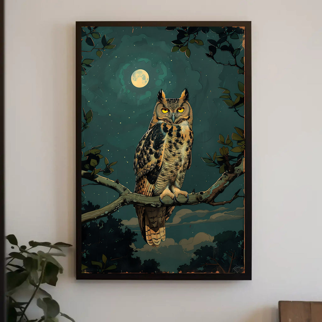 Why you’ll love it: This poster balances tranquil moonlight tones with intricate feather detailing to evoke a serene atmosphere while serving as a statement piece—an elegant way to bring wildlife illustration and moonlight artwork into your decor.