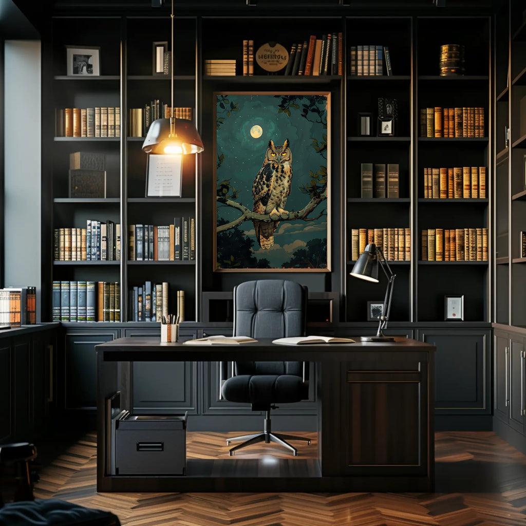 Art & Design: Modern illustrative art with minimalist, Mid-Century Modern styling—clean lines, rich teal night sky, and finely rendered feather detail that captures the owl’s poised presence.