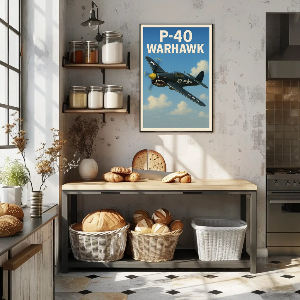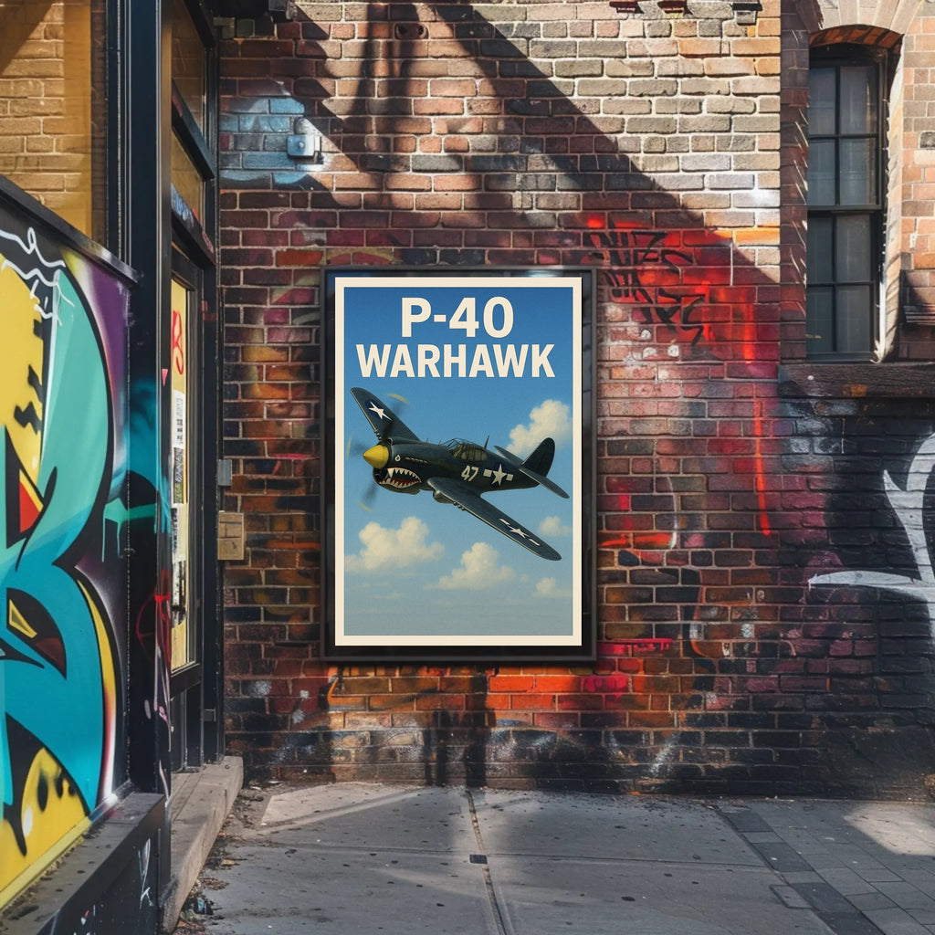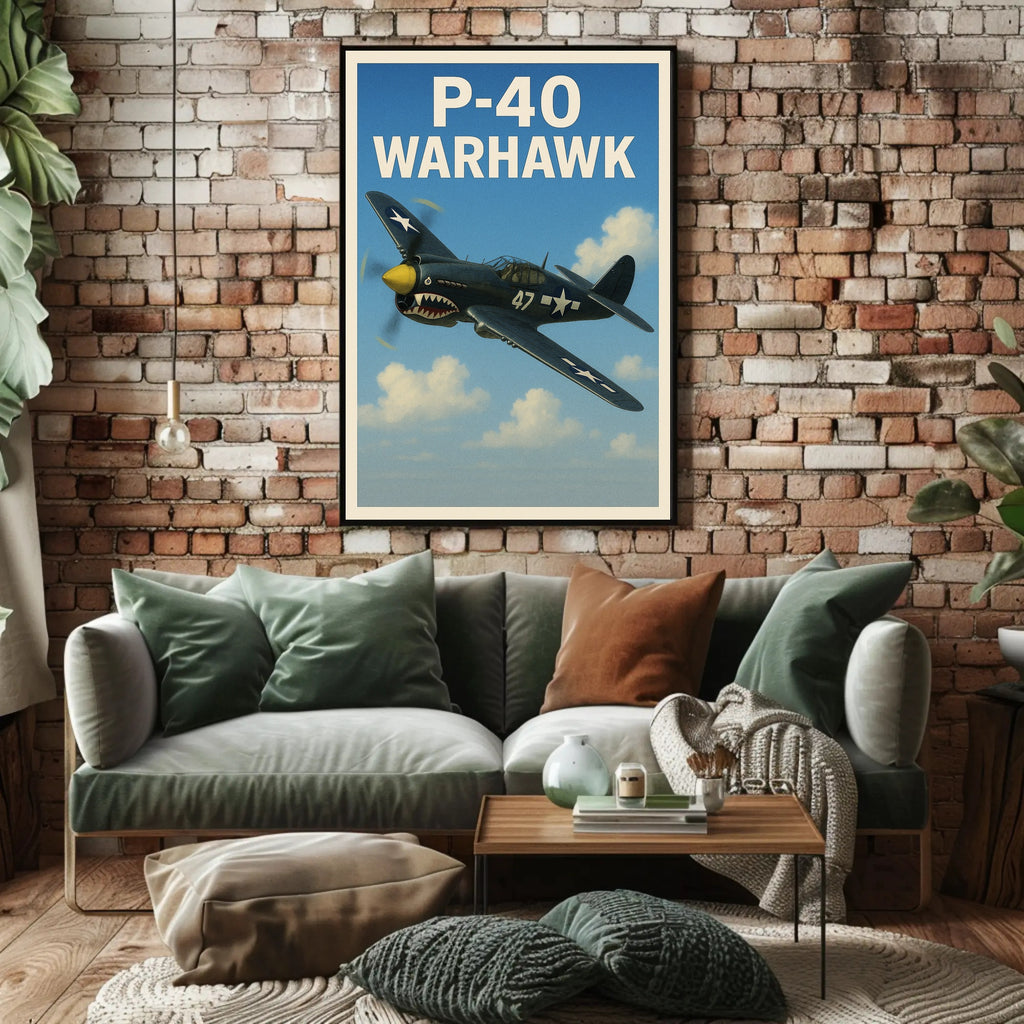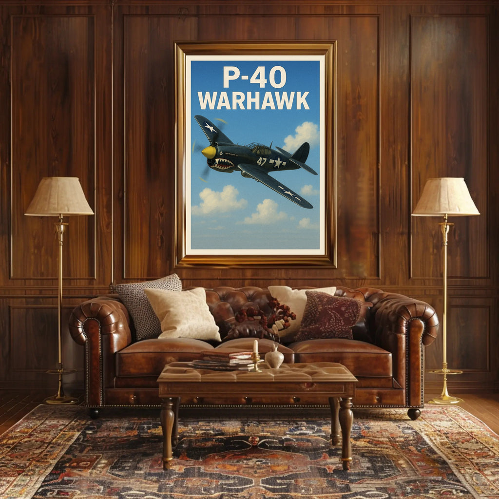 High-impact design: Photorealism meets vintage poster typography—large "P-40 WARHAWK" header and a dynamic angled view of the aircraft create an instant focal point.