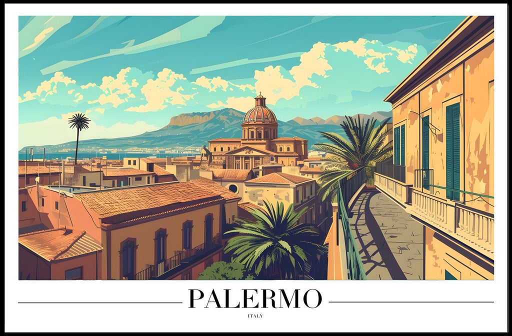 Bring Palermo's sun-drenched skyline into your space. This PosterGoat travel poster captures a vintage-style cityscape of Palermo with warm terracotta roofs, a classic dome, sweeping Mediterranean vistas and elegant palm trees — a minimalist, artful illustration that evokes wanderlust and Italian charm.