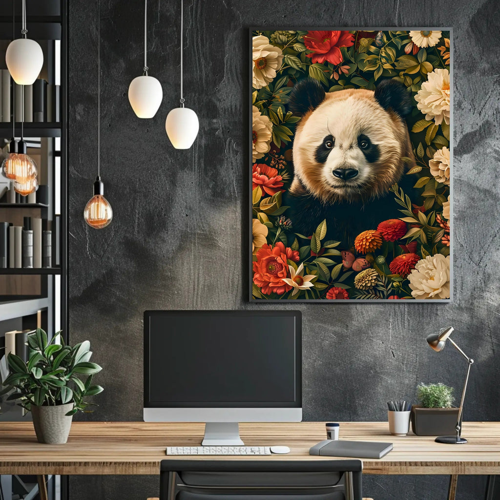 Bring a touch of nature and whimsy to your walls with the Panda in Bloom Wall Art Decor Print from PosterGoat. This striking poster places an expressive panda at the center of a rich, botanical frame — lush leaves, layered petals, and warm jewel-toned florals create depth and a timeless, minimalist aesthetic that complements modern interiors.