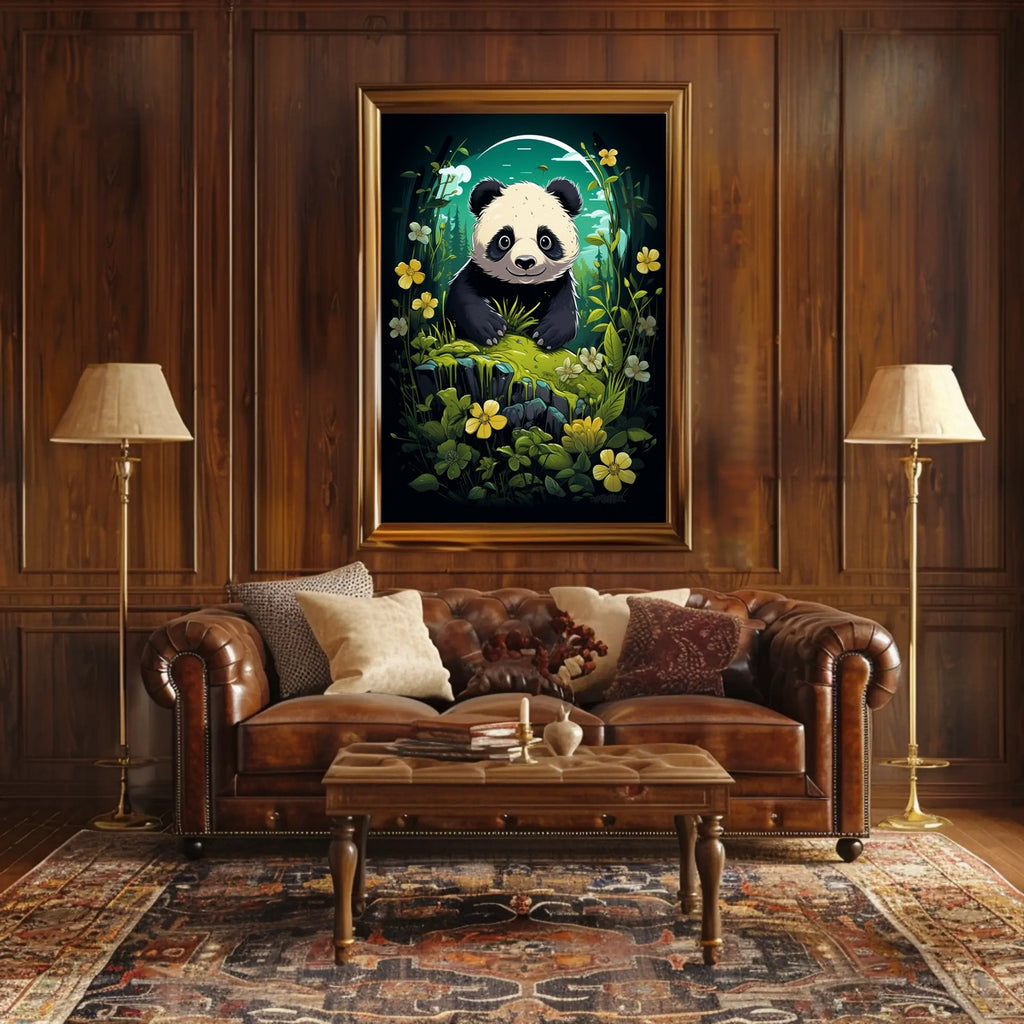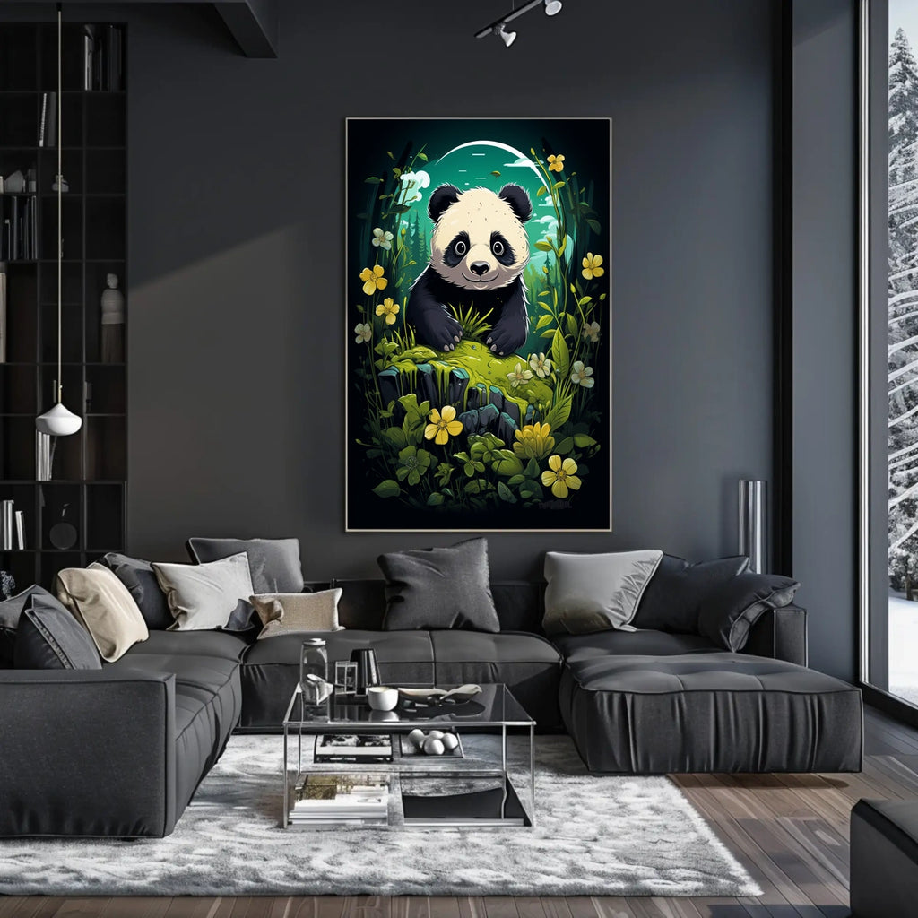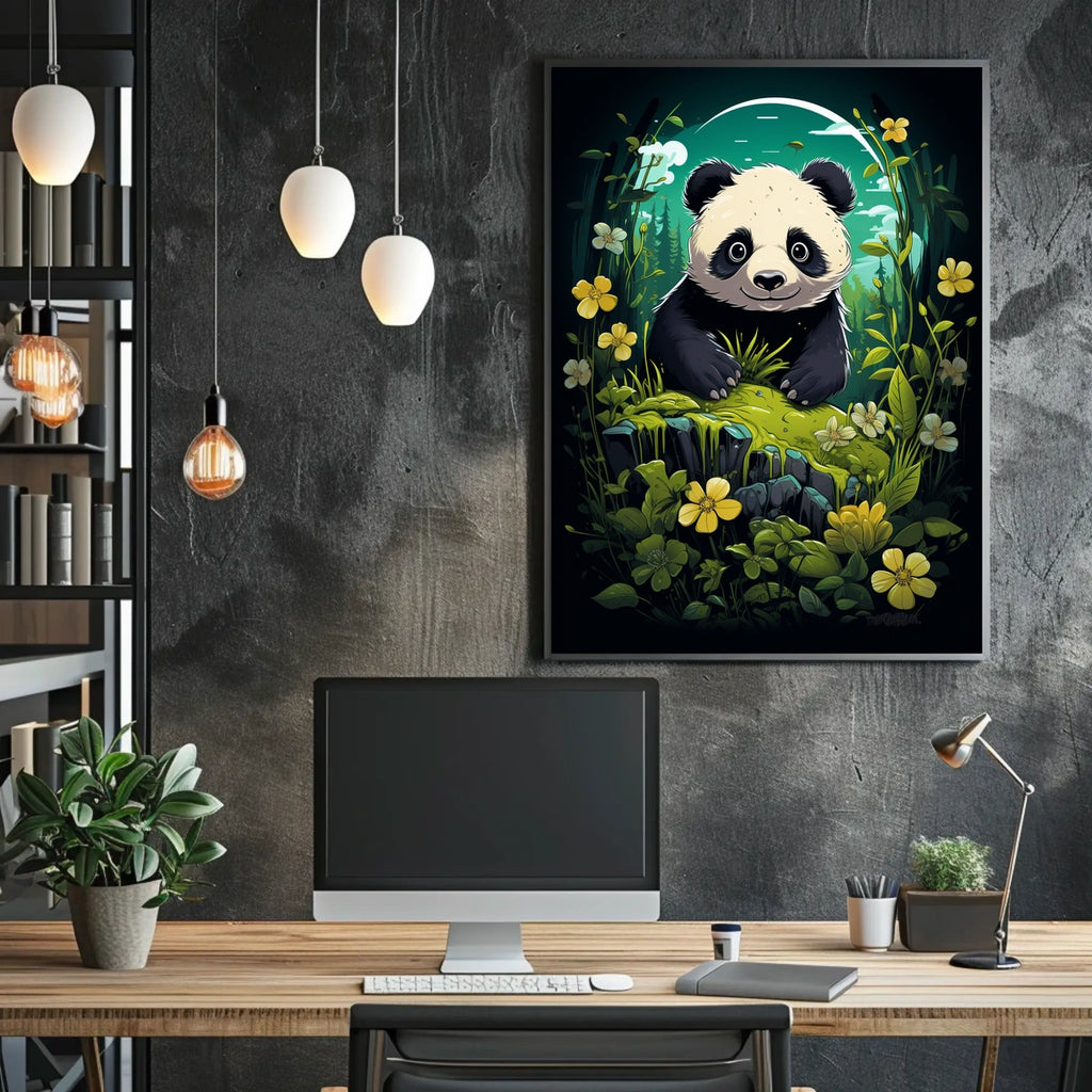 Immerse yourself in a world of wonder with this enchanting poster featuring a delightful panda nestled in a lush, whimsical forest. The large, expressive panda rests peacefully on a moss-covered rock, surrounded by vibrant yellow and green flowers and dense foliage. This modern, cartoon-like illustration bursts with vivid colors, creating a playful and eye-catching piece. The cheerful, nature-focused theme evokes innocence and wonder, making it perfect for children's rooms or nature enthusiasts.