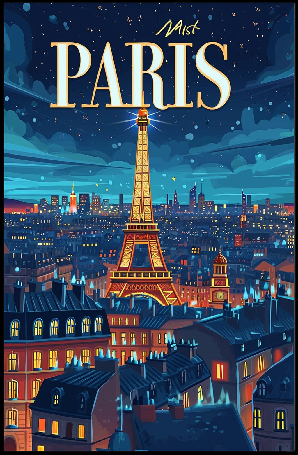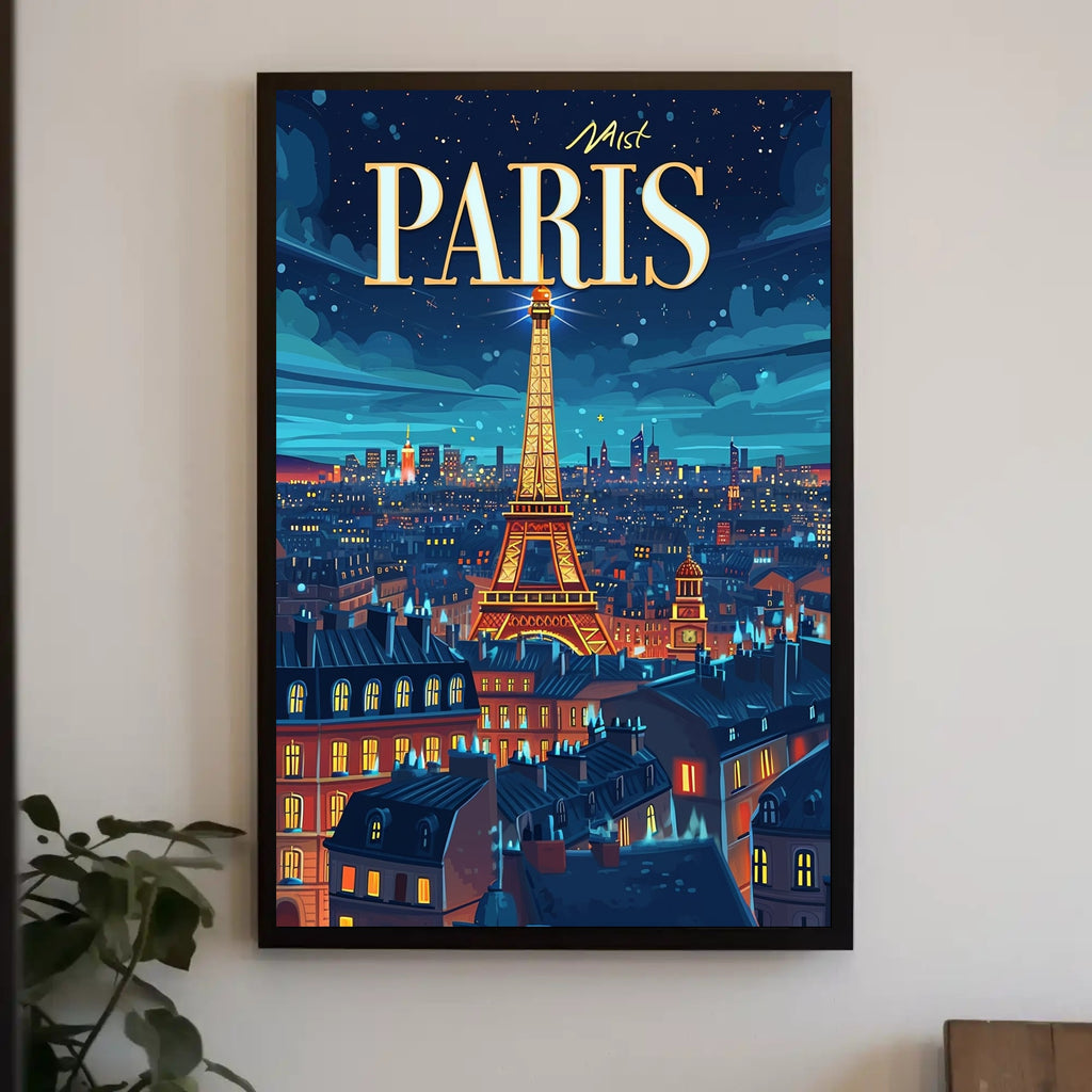 Capture the romantic glow of Paris with the Parisian Nighttime Enchantment Urban Cityscape Poster from PosterGoat. This vivid cityscape illustration showcases the illuminated Eiffel Tower rising above classic Parisian rooftops beneath a star-speckled night sky — a striking blend of whimsical charm and modern mid-century style that transforms any room into a Parisian escape.