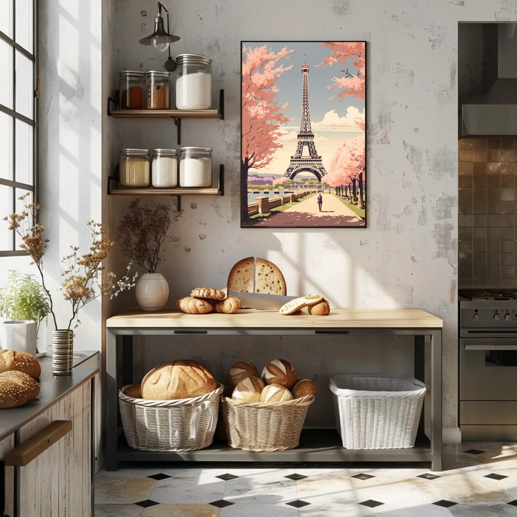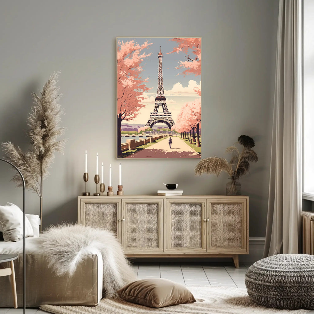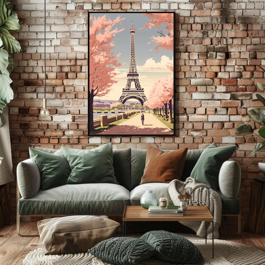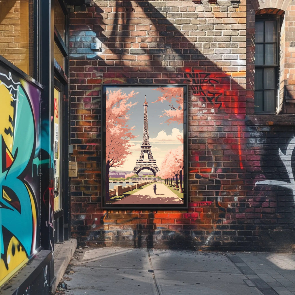 This beautiful poster captures the iconic Eiffel Tower surrounded by a stunning array of cherry blossom trees in Paris, France. The illustration combines modern and vintage elements, using soft pastel colors to enhance the tranquil, romantic atmosphere. A solitary figure walking along the blossom-lined pathway offers a touch of introspection and peace, embodying the essence of a serene spring day in an urban park by the waterfront. Ideal for lovers of travel and art, this poster celebrates the idyllic beauty and alluring charm of the City of Light, making it a perfect addition to any space.