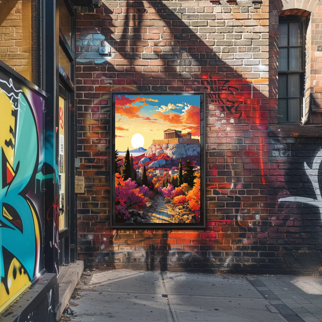 Bring the grandeur of ancient Greece into your home with this striking Parthenon Sunset Majesty poster. Rendered in a modern pop-art style, the scene captures the Parthenon perched atop a rugged Acropolis, bathed in warm sunset tones — vibrant oranges, deep purples and rich reds — with a glowing sun on the horizon and dramatic cloud formations above.