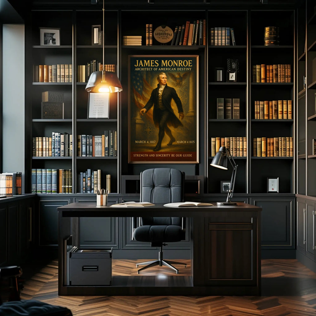 This captivating poster beautifully captures the essence of early 19th century America through the portrayal of a distinguished historical male figure exemplifying leadership and vision. With a warm, vintage, painterly style, the artwork skillfully uses realism to highlight the period's national spirit, underpinned by symbolic elements like the American flag and the emblematic eagle. The addition of a compass rose and classical columns evokes a sense of exploration and historical significance. This poster not only serves as an inspirational piece but also as a tribute to unwavering patriotism and guiding principles.