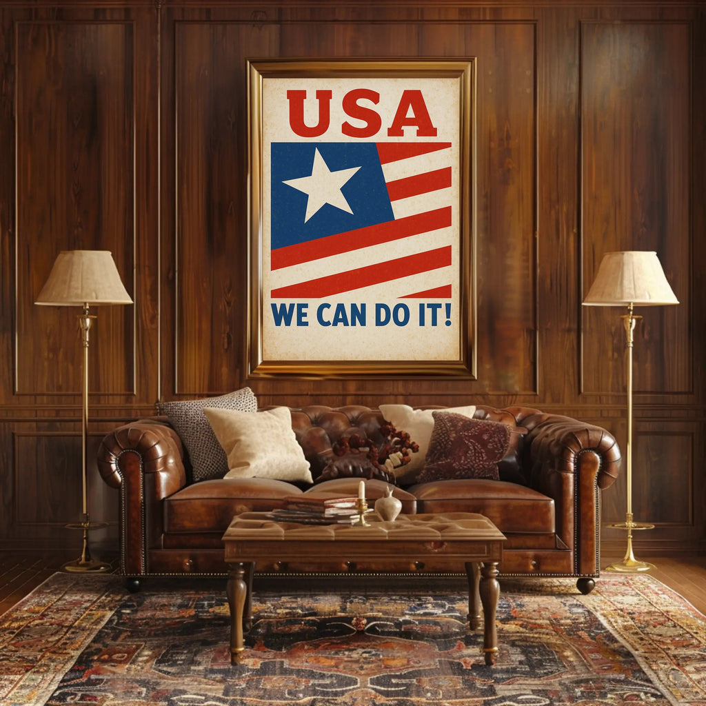 Celebrate pride and perseverance with the Patriotic Encouragement Poster from PosterGoat — a bold, minimalist artwork that blends vintage charm with motivational energy. Featuring large, blocky "USA" lettering, a stylized star and angled flag stripes, and the inspiring proclamation "WE CAN DO IT!", this poster makes a standout statement in any home, office, or public space.
