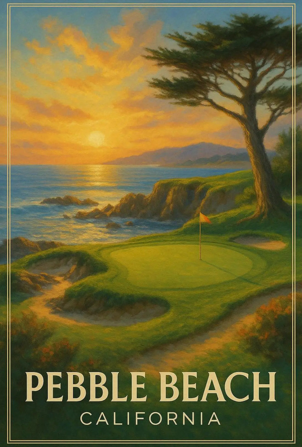 Whether you’re a fan of golf course decor, coastal landscapes, or vintage travel art, this Pebble Beach poster brings serene sunset hues and iconic scenery into your space. Order your PosterGoat print today and transform a blank wall into a scenic escape.