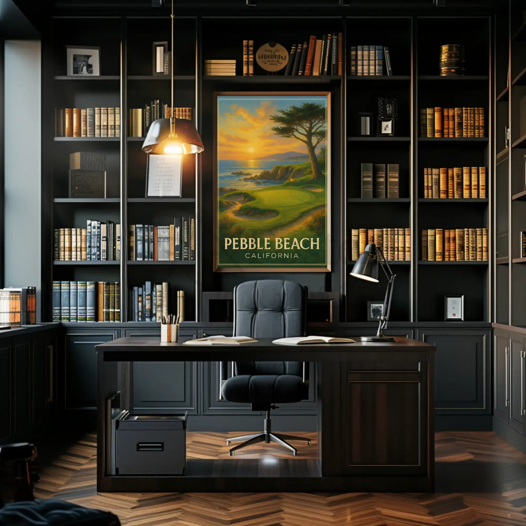 Bring the timeless charm of California's coast into your home with the Pebble Beach Golf Course Vintage Travel Poster from PosterGoat. This artful print captures a sun-drenched seaside green, dramatic cliffs and a lone cypress set against a golden sunset—an evocative blend of vintage travel art and minimalist design that complements any living space, office, or golf-lover’s den.