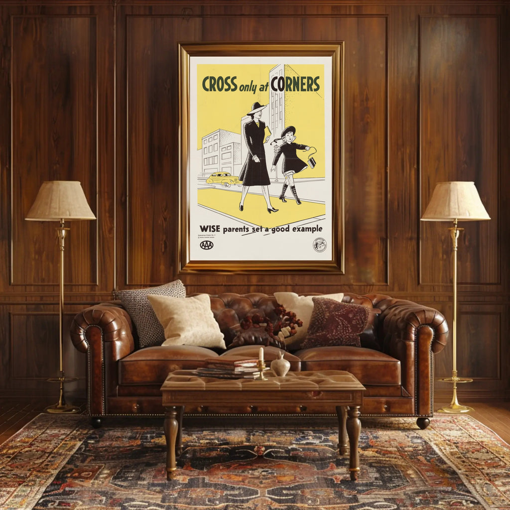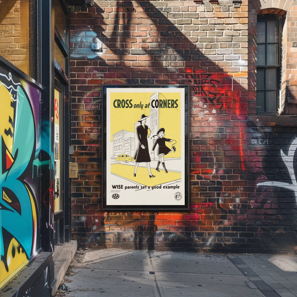 This evocative mid-century poster, from the American Automobile Association, highlights pedestrian safety in urban environments. Showcasing a formal woman and a child crossing a bustling street, the vivid illustration emphasizes responsible behavior in city settings. The vintage style, with a limited palette of yellow, black, and white, and clear bold lines, captures the essence of 1950s commercial art. The educational mood is accentuated by a vintage car, traffic light, and AAA logo in the background, reinforcing its message of safety awareness and responsibility for both adults and children.