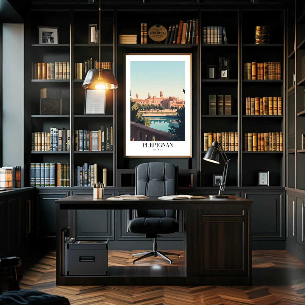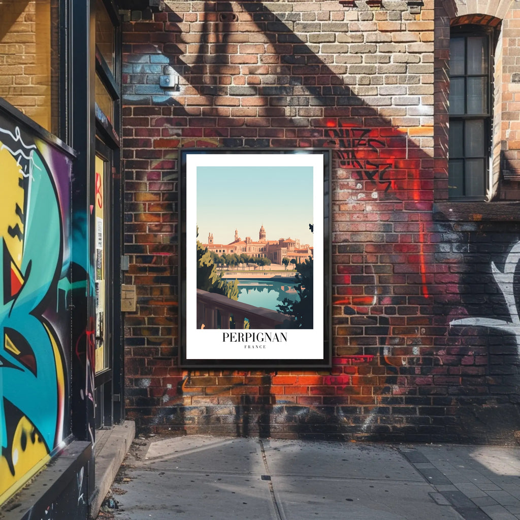 Experience the charm of Perpignan with this stunning poster that captures the enchanting blend of historic architecture and serene natural beauty. The scene presents intricate towers that rise above a tranquil waterway, set amidst lush greenery, illustrating a quintessential view of this iconic French city's architectural heritage. Rendered in a modern style with smooth lines and soft colors, this artwork offers a fresh, stylized perspective that adds a touch of elegance and sophistication to any space. Perfect for art lovers and travel enthusiasts, this poster is a timeless homage to Perpignan's unique cityscape.