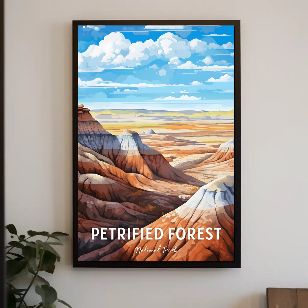 Bring the sweeping beauty of Petrified Forest National Park into your home with this vibrant, museum-quality poster from PosterGoat. Rendered in warm desert hues and crisp sky-blue contrasts, the print captures layered badlands, dramatic ridgelines, and the expansive horizon—an instant focal point for living rooms, offices, or gallery walls.