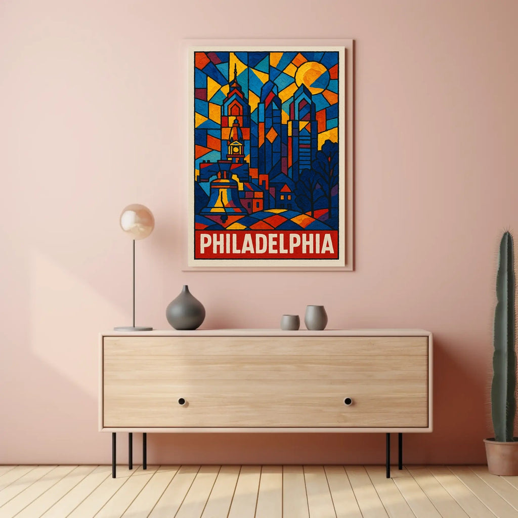 Whether you’re decorating a living room, study, or workspace, this stained-glass-inspired poster adds color, charm, and a touch of wanderlust to any wall. A unique souvenir of Philadelphia, it’s perfect for fans of scenic wall art and architectural detail.