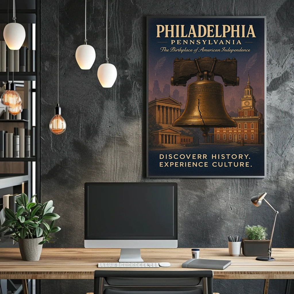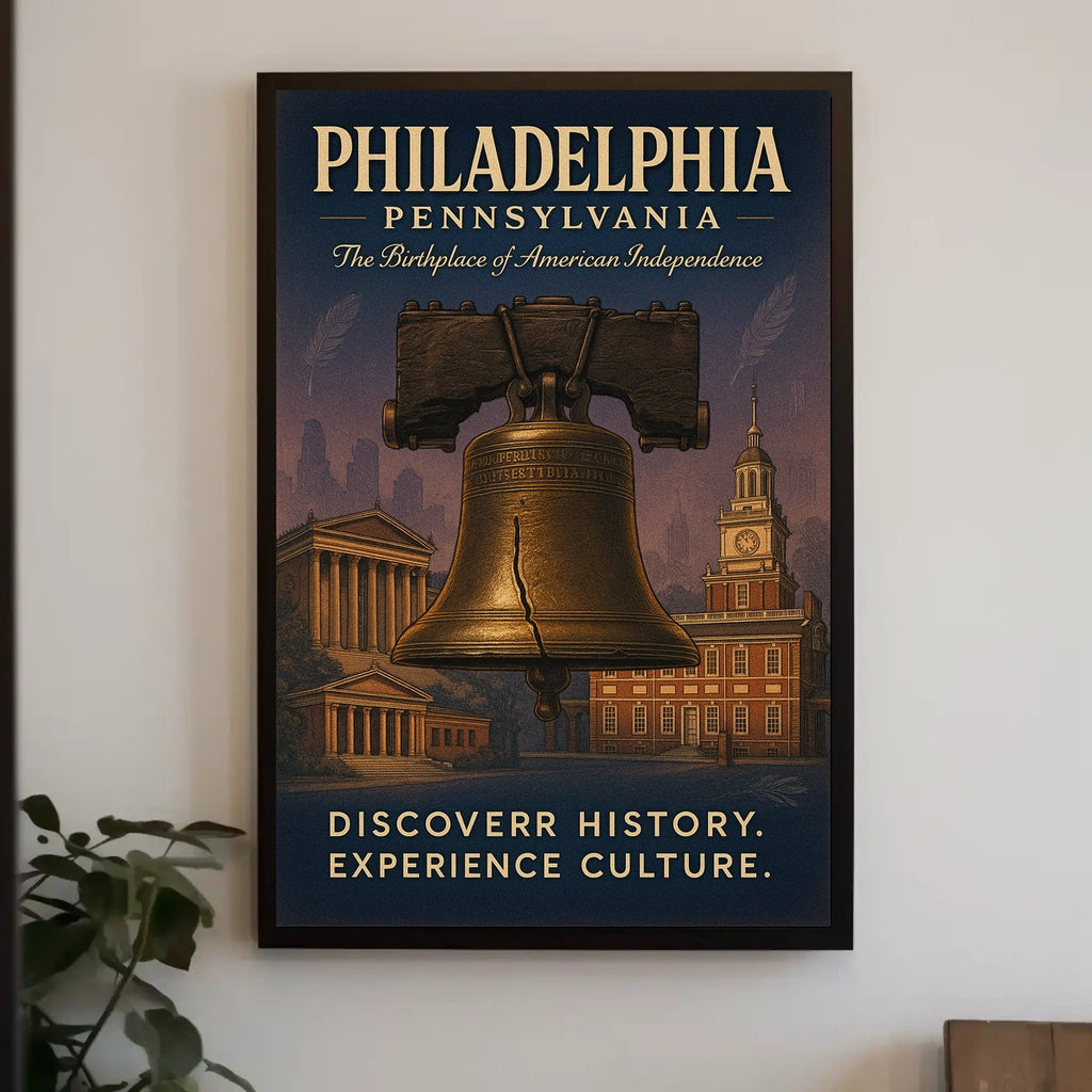 Liberty Bell poster celebrating Philadelphia's birthplace of American independence captures a timeless symbol of freedom. This american history poster in a vintage lithograph style centers the Liberty Bell, surrounded by historical landmarks and nods to Philadelphia history, blending cultural heritage with patriotic artwork.