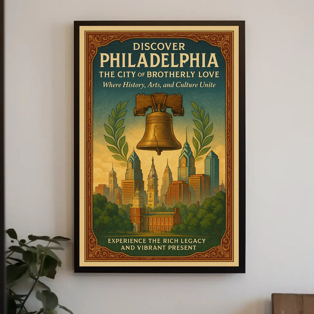 Designed with warm earthy tones, the poster pairs the Liberty Bell with olive branches and a sweeping Philadelphia skyline, blending iconic symbolism with nostalgic wall art that complements both traditional and modern interiors.
