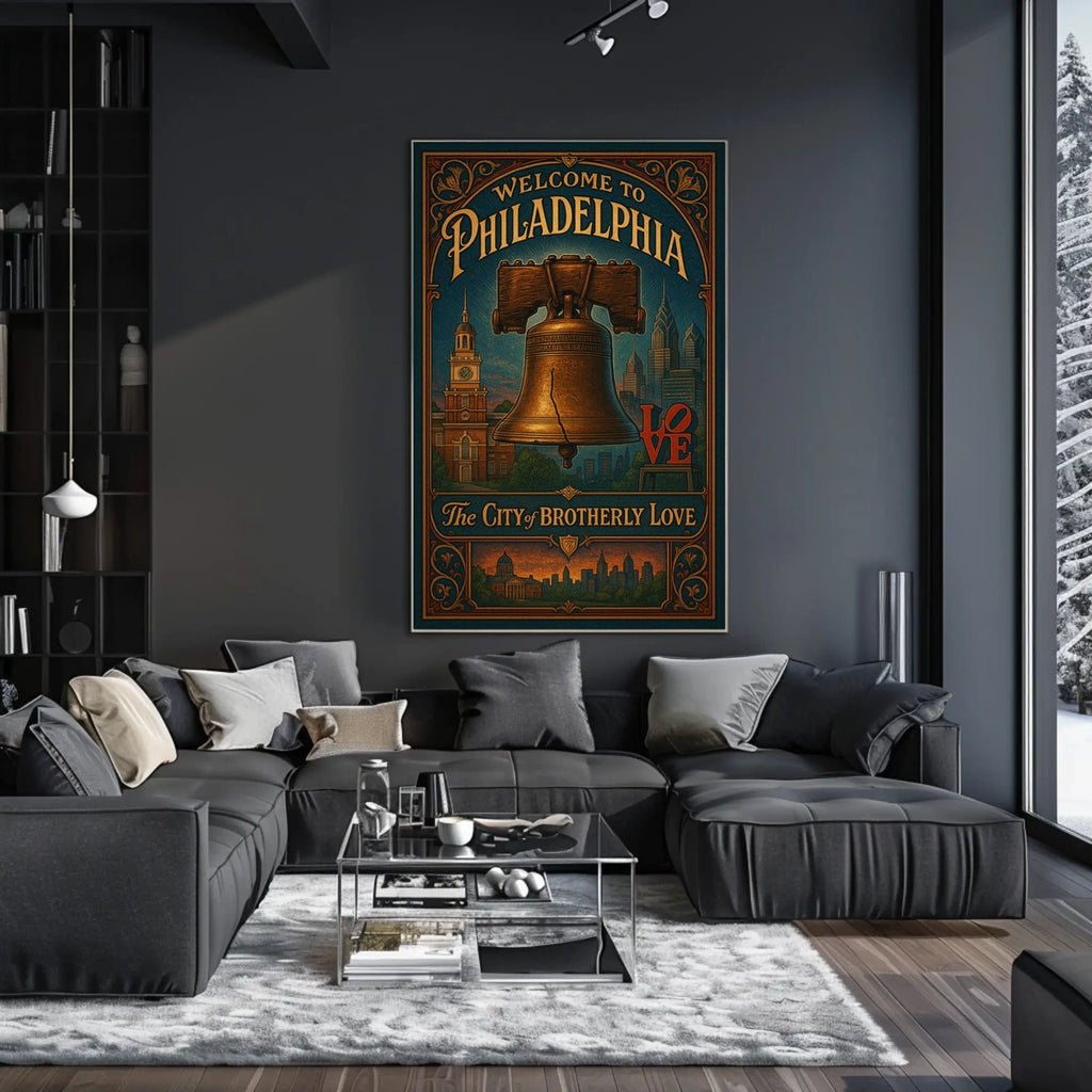 The design blends a vintage aesthetic with travel-poster appeal, making it ideal for patriotic decor and nostalgic art lovers alike. It artfully nods to Philadelphia landmarks, from Independence Hall to the Philadelphia skyline, while keeping the focus on timeless symbols.