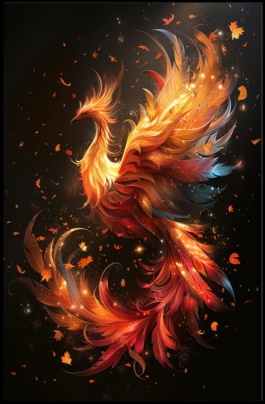 Phoenix Rebirth: Vibrant Fantasy Art Poster invites you to immerse yourself in the captivating world of fantasy. This exquisite poster features a mythical phoenix in a breathtaking display of color and movement. Set against a dark, ethereal backdrop, the phoenix's fiery plumage in shades of red, orange, and gold, accented with hints of blue, creates a striking contrast. Intricate detail in the feathers conveys dynamic energy as the creature soars through the sky. Surrounded by autumn leaves and glowing sparks, this modern, stylized artwork evokes themes of renewal and resilience, making it a perfect addition to any inspirational art collection.