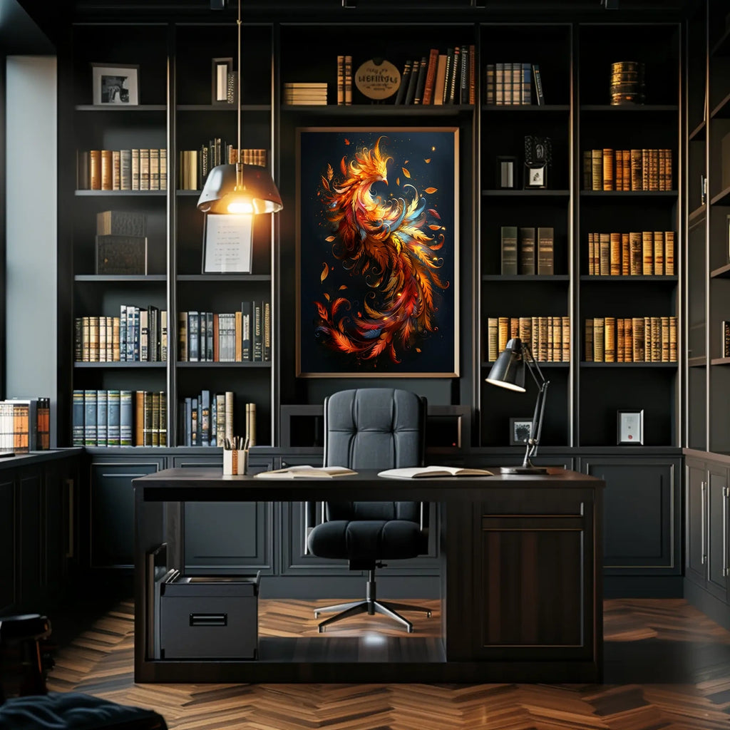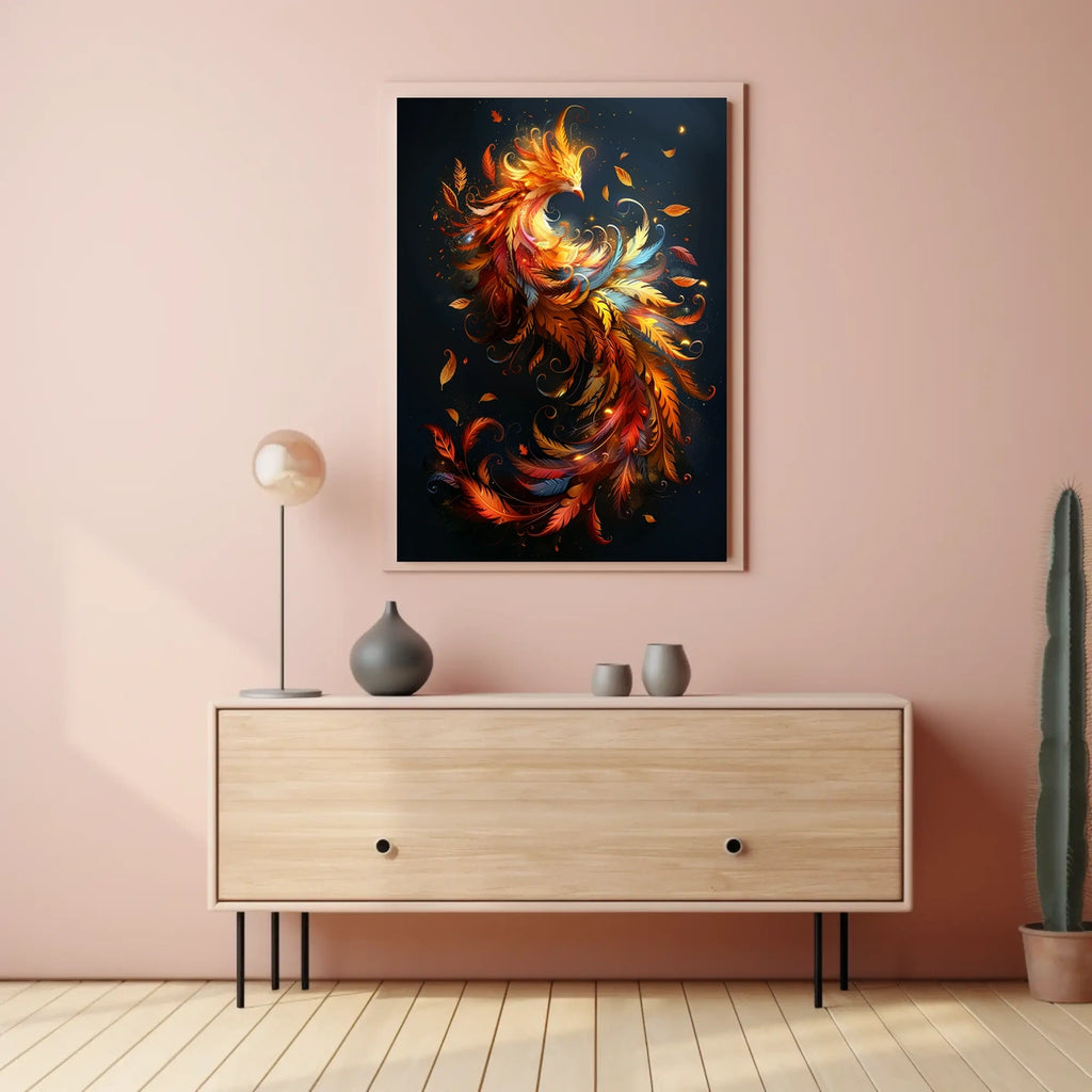 Whether you display it in a living room, study, or gallery wall, this phoenix rising artwork adds dynamic energy to any space. With rebirth symbolism and a transformation theme, it stands out as a bold centerpiece in modern fantasy art and home decor art. This phoenix illustration and phoenix wall art is perfect for fans of mythical creatures decor and lovers of vibrant colors and vibrant feathers.