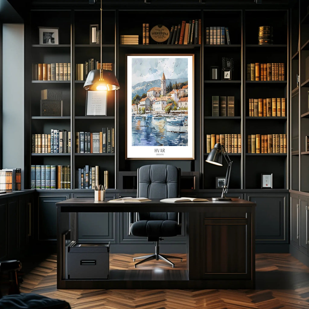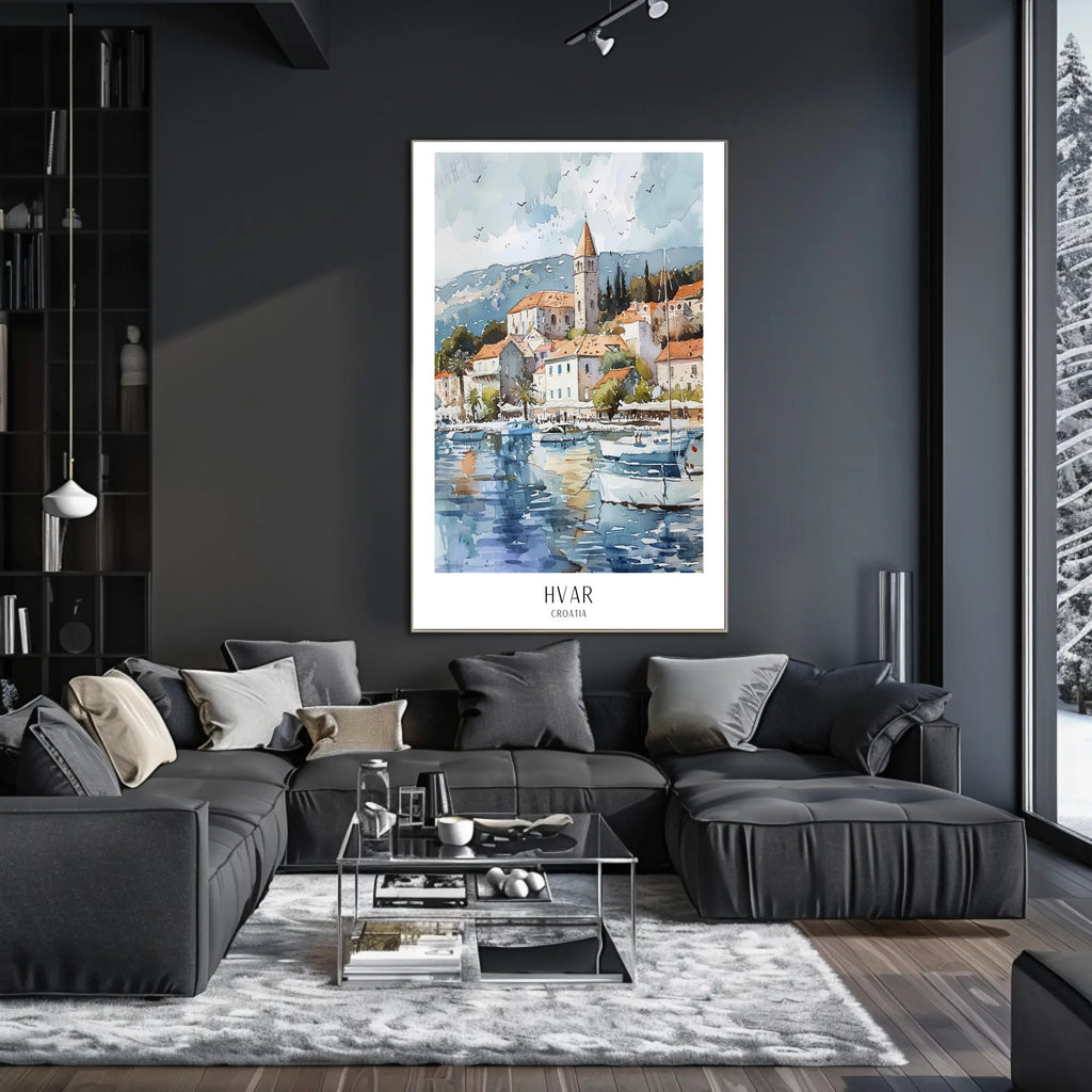 Experience the serene beauty of a coastal town in Hvar, Croatia, with this breathtaking watercolor poster. Capturing the old-world charm of historic buildings with traditional terracotta roofs, this impressionistic artwork transports you to a quaint European seaside village. A prominent church with a bell tower, lush green hills, and a clear blue sky create a captivating backdrop, while sailboats gently float on the tranquil waterfront. The soft, dreamy color palette and fluid brushstrokes evoke nostalgia and wanderlust, making this poster an ideal addition for travel enthusiasts and architecture admirers alike.