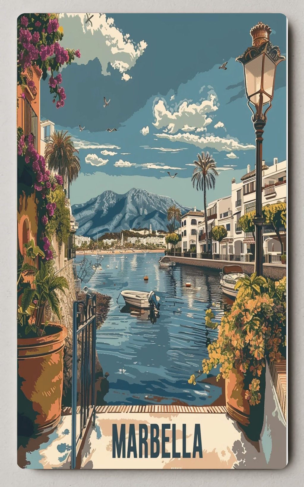- Iconic Marbella imagery: Palm trees, waterfront homes, reflective water and floral accents evoke coastal charm and Mediterranean escape.