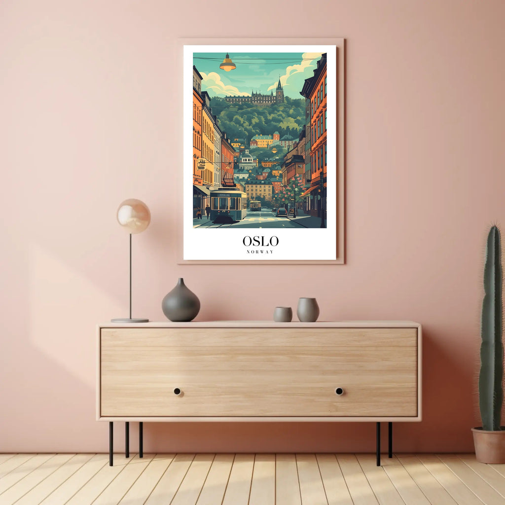 Immerse yourself in the enchanting allure of Oslo with this picturesque street scene poster, capturing the essence of urban architecture against scenic hills. This artwork celebrates the harmonious blend of history and modernity, featuring a vintage-inspired style with a modern twist. Warm and inviting hues bring to life the bustling streets lined with charming buildings, while a tram adds a dynamic element to the tranquil composition. Notably, a majestic historical building stands majestically atop a lush hill, symbolizing Oslo's rich heritage. Perfect for admirers of urban landscapes and Scandinavian charm, this poster is a timeless addition to any space.