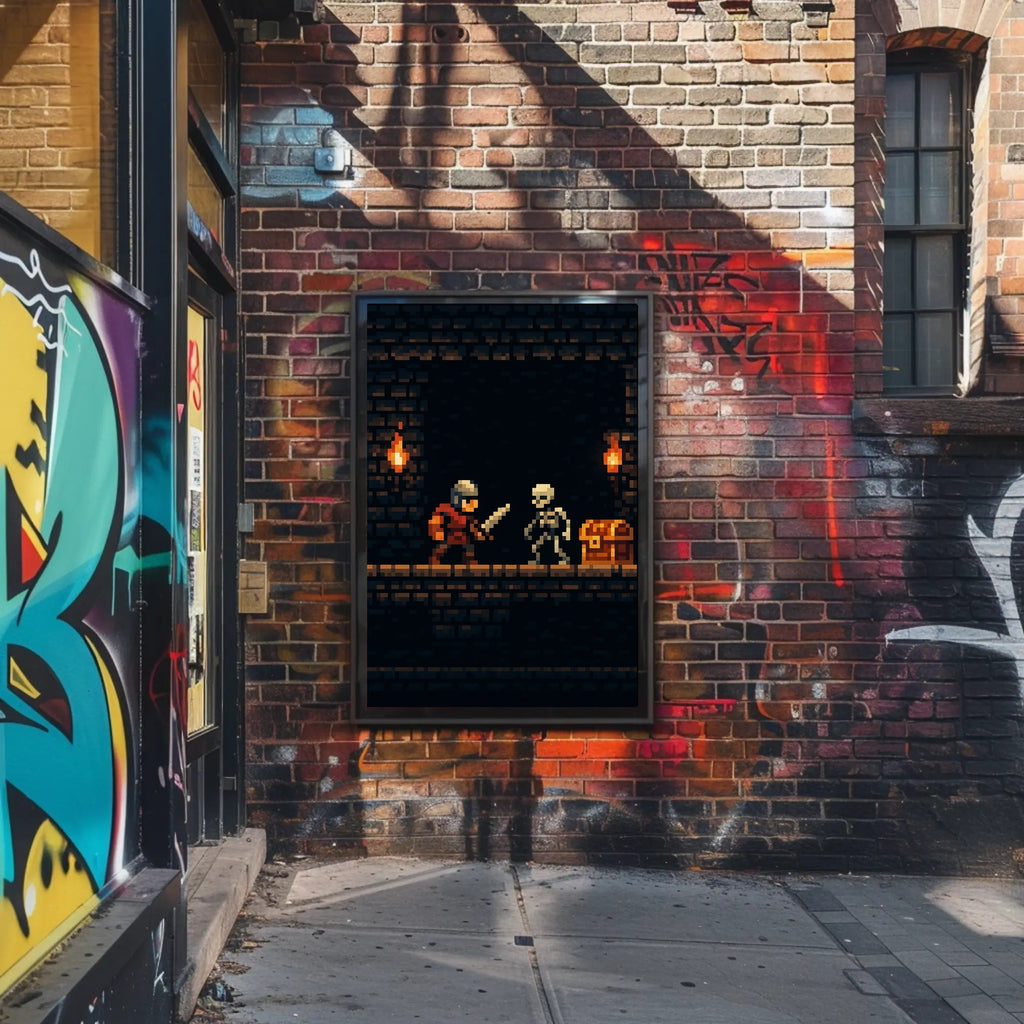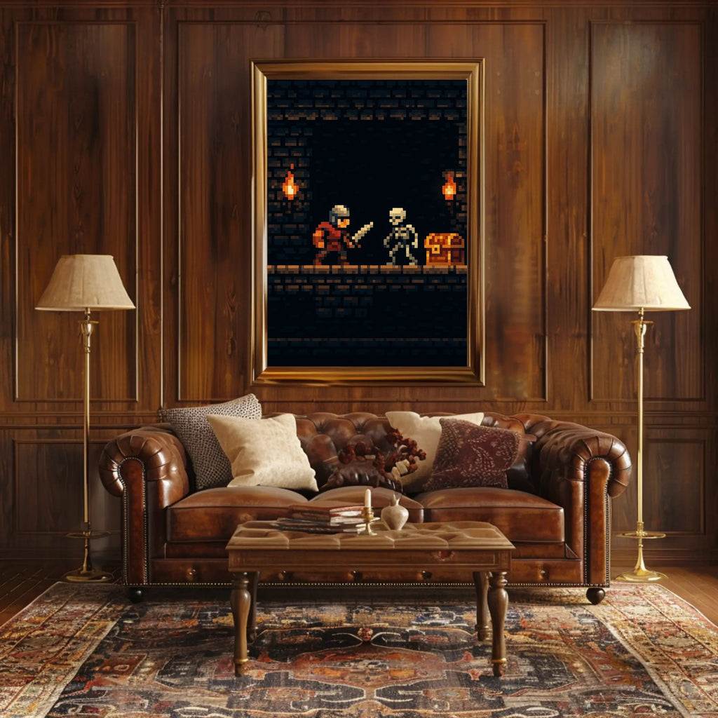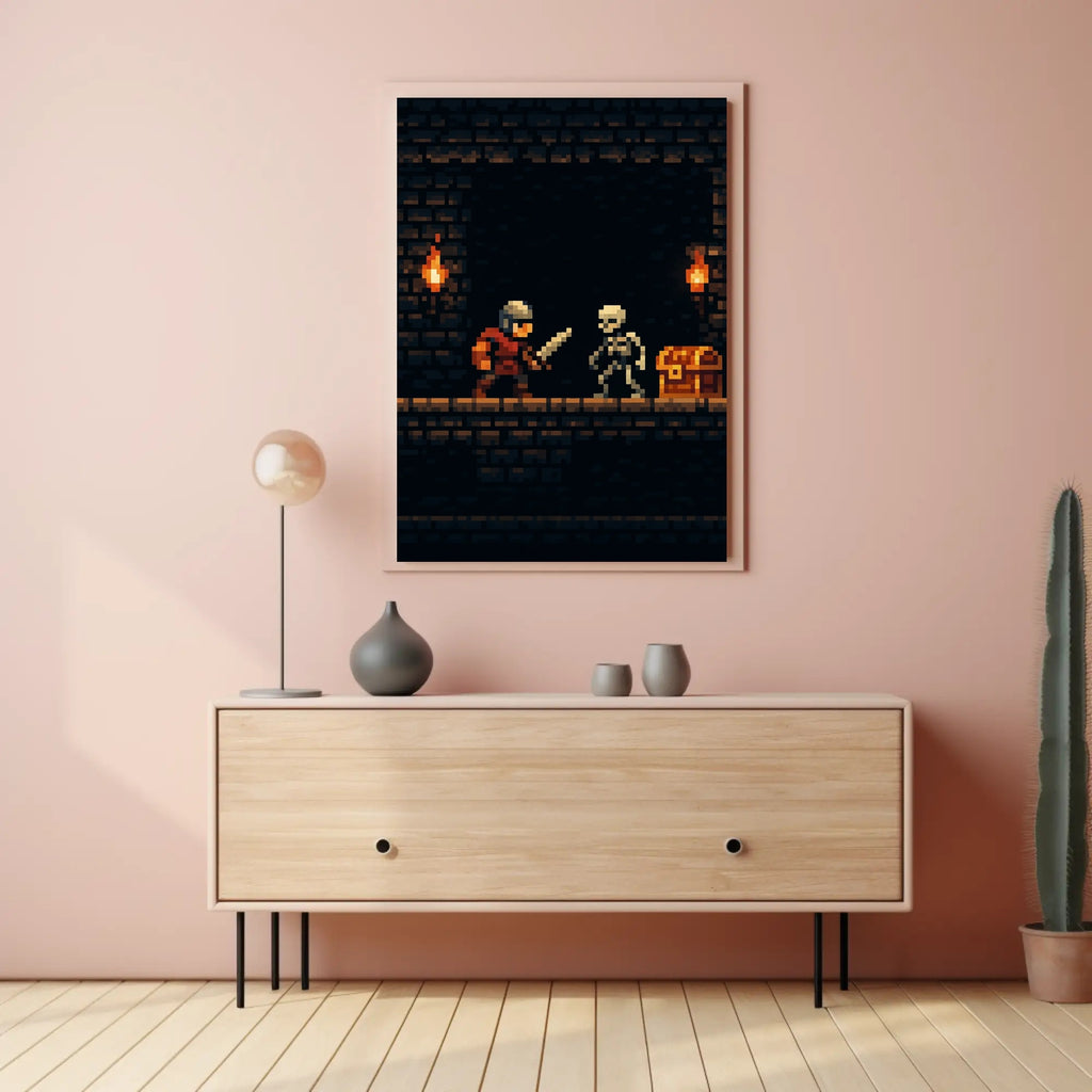 Dive into a world of nostalgia with this pixel art poster, capturing the essence of vintage gaming. The artwork showcases a medieval knight in a tense standoff with a skeleton adversary, embodying classic adventure and quest themes. Set in a dungeon-like environment, dark brick walls and the warm glow of torches create a bold, adventurous mood. This piece not only reflects the charm of retro video games but also serves as a tribute to the simplistic yet captivating art style of a bygone era, perfect for gaming enthusiasts and art lovers alike.