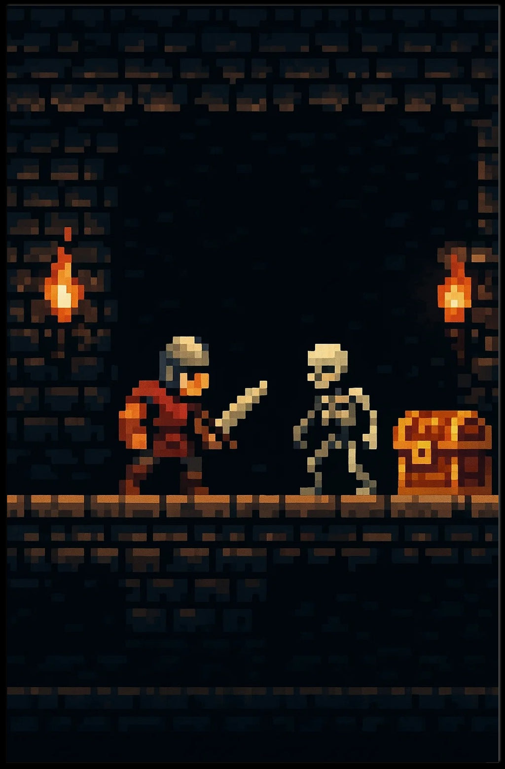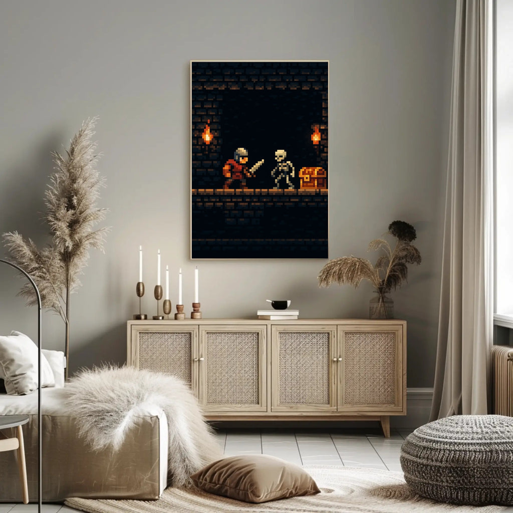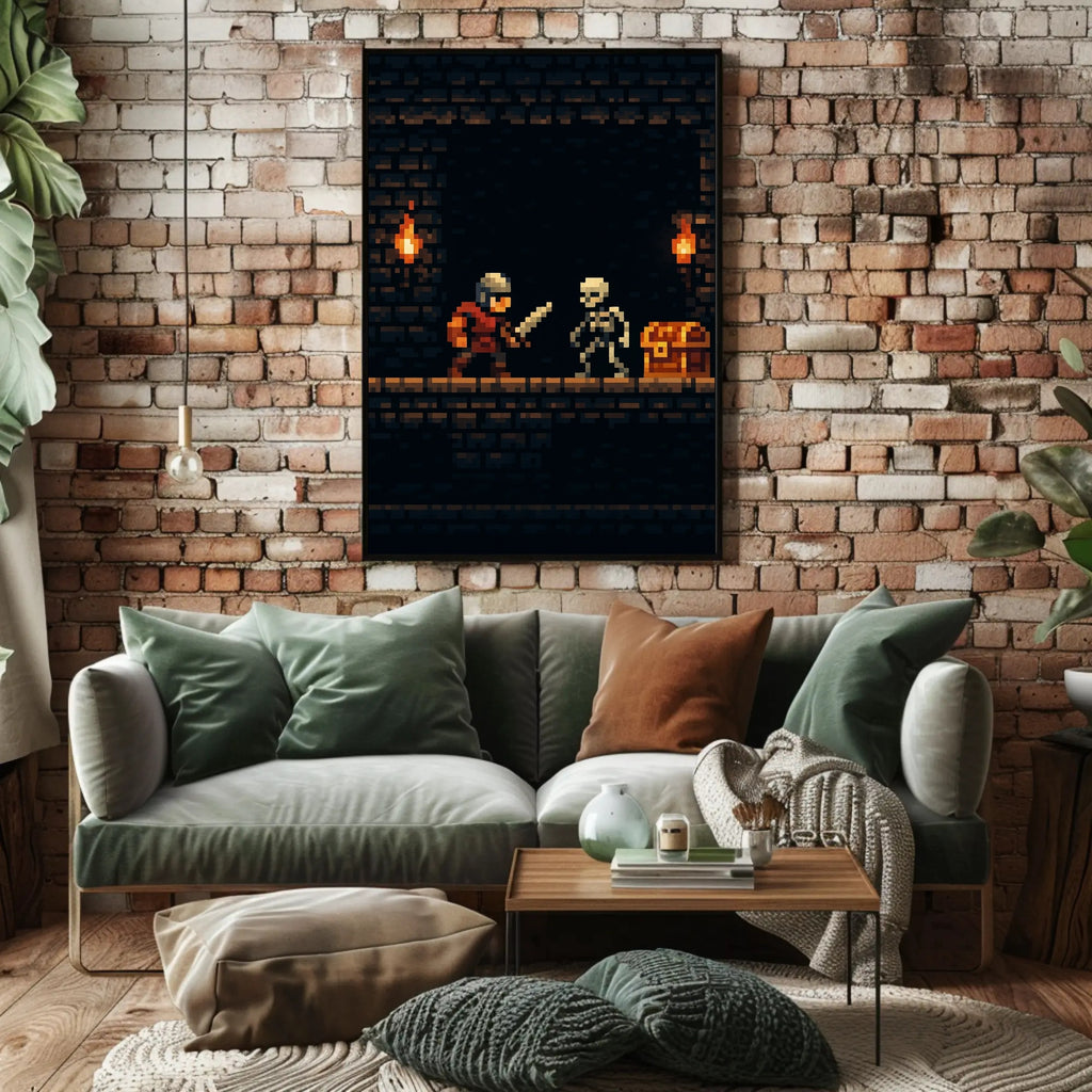 Dive into a world of nostalgia with this pixel art poster, capturing the essence of vintage gaming. The artwork showcases a medieval knight in a tense standoff with a skeleton adversary, embodying classic adventure and quest themes. Set in a dungeon-like environment, dark brick walls and the warm glow of torches create a bold, adventurous mood. This piece not only reflects the charm of retro video games but also serves as a tribute to the simplistic yet captivating art style of a bygone era, perfect for gaming enthusiasts and art lovers alike.