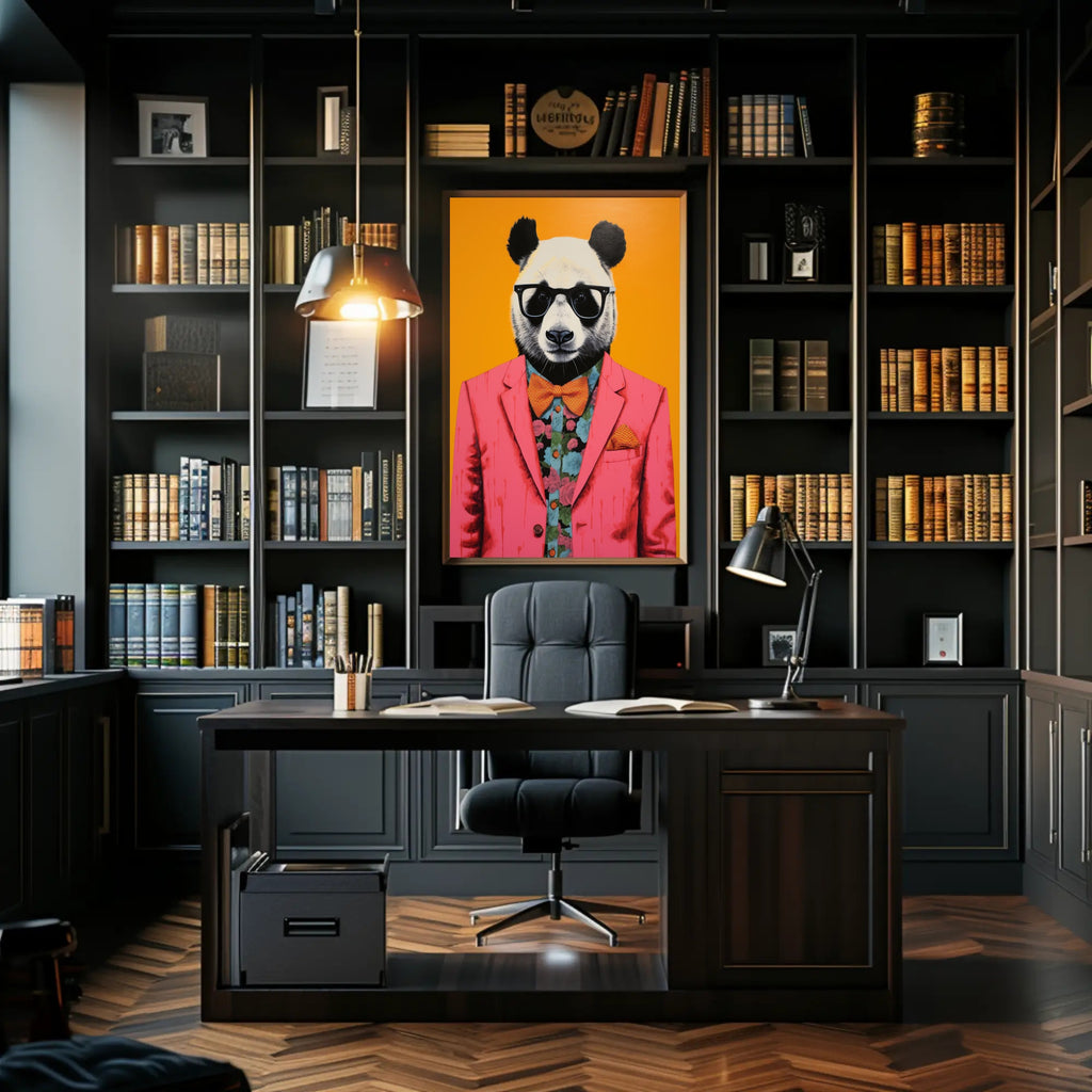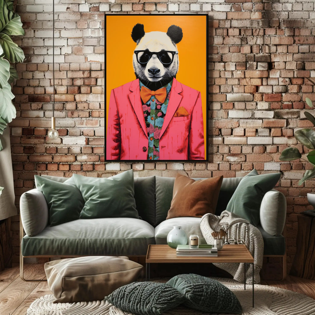 Bring bold personality to your walls with the Playful and Sophisticated Panda Animal Poster from PosterGoat — a pop art favorite that pairs whimsical charm with modern design. This striking print features a stylized panda wearing chic black glasses, a bright pink blazer, a floral shirt and a textured orange bowtie against a high-contrast orange backdrop. Clean lines, vivid colors and fine illustrative detail create a piece that reads as both humorous and refined.