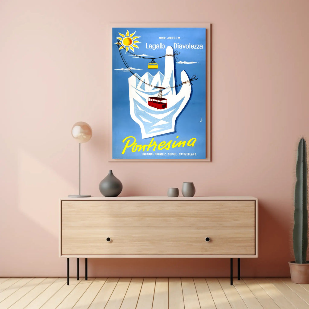 Bring the alpine charm of Pontresina into your home with this striking Pontresina Mountain Cable Cars Poster by PosterGoat. A minimalist, vintage-inspired travel print, it features bold blue skies, stylized mountains and two cable cars — a vivid red cabin and a sunny yellow gondola — suspended above a graphic glacial hand. Perfect for decor lovers, travel art collectors and anyone who wants a touch of Swiss scenery on their wall.