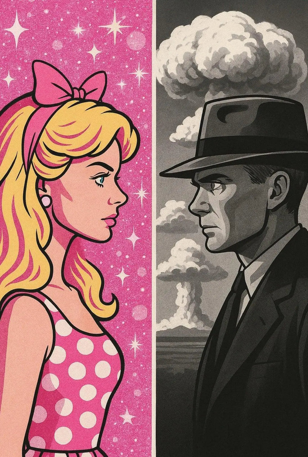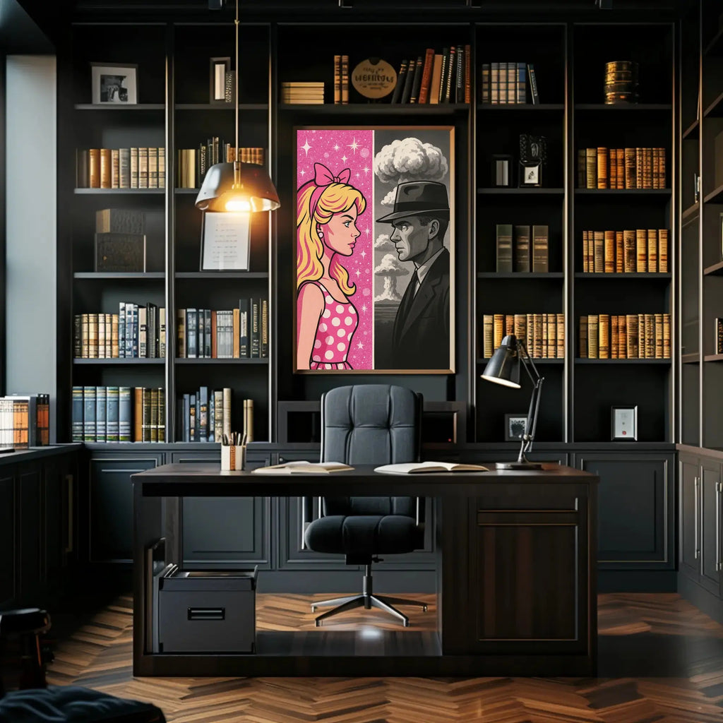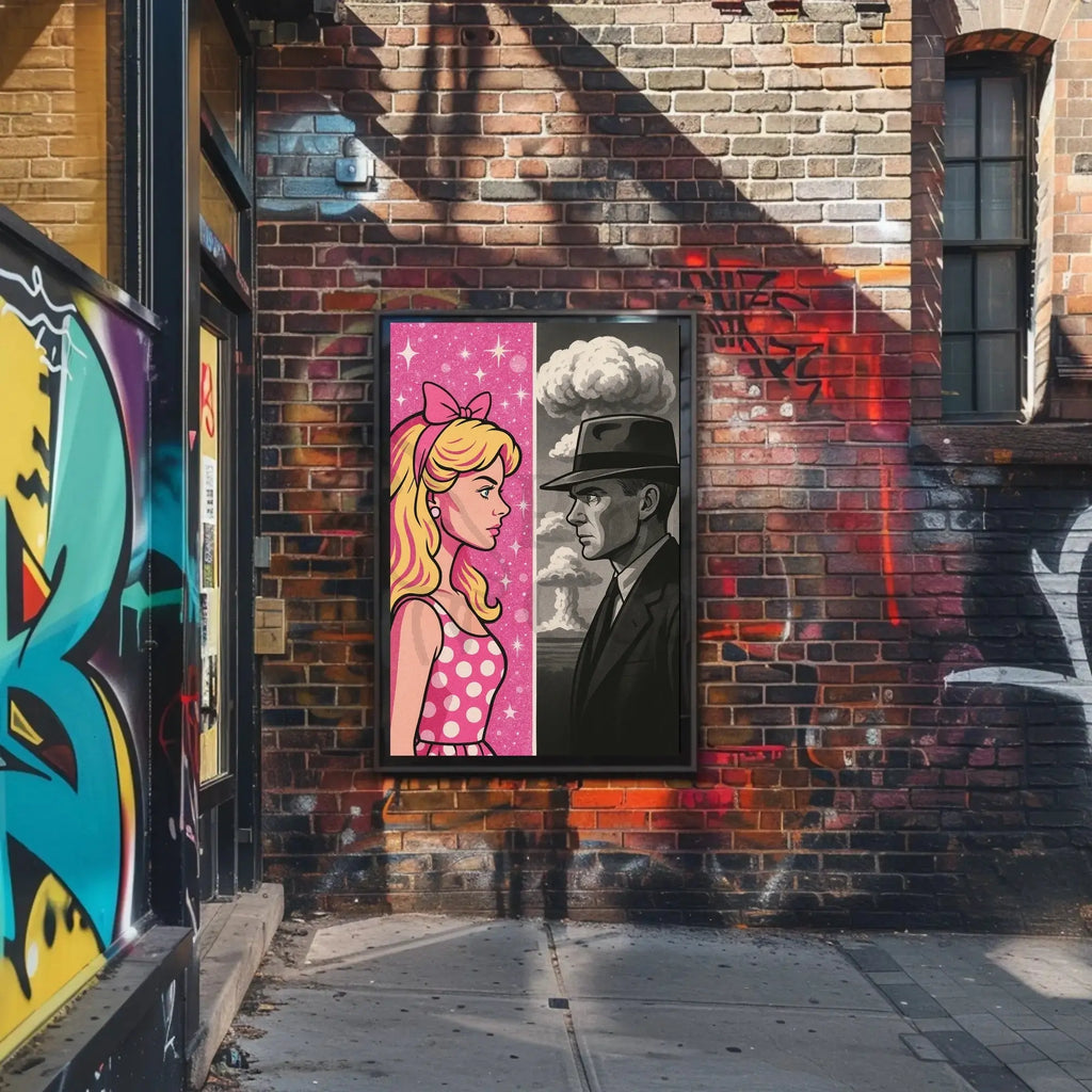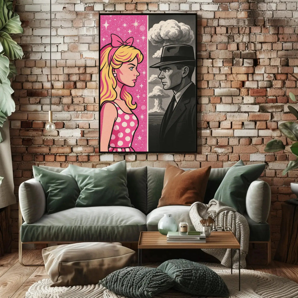 This eye-catching print features a vibrant, stylized woman in a pink polka-dot dress and bow on the left, contrasted against a moody, grayscale gentleman in a fedora on the right — complete with dramatic cloud formations and a looming mushroom cloud that adds cinematic tension and narrative depth.