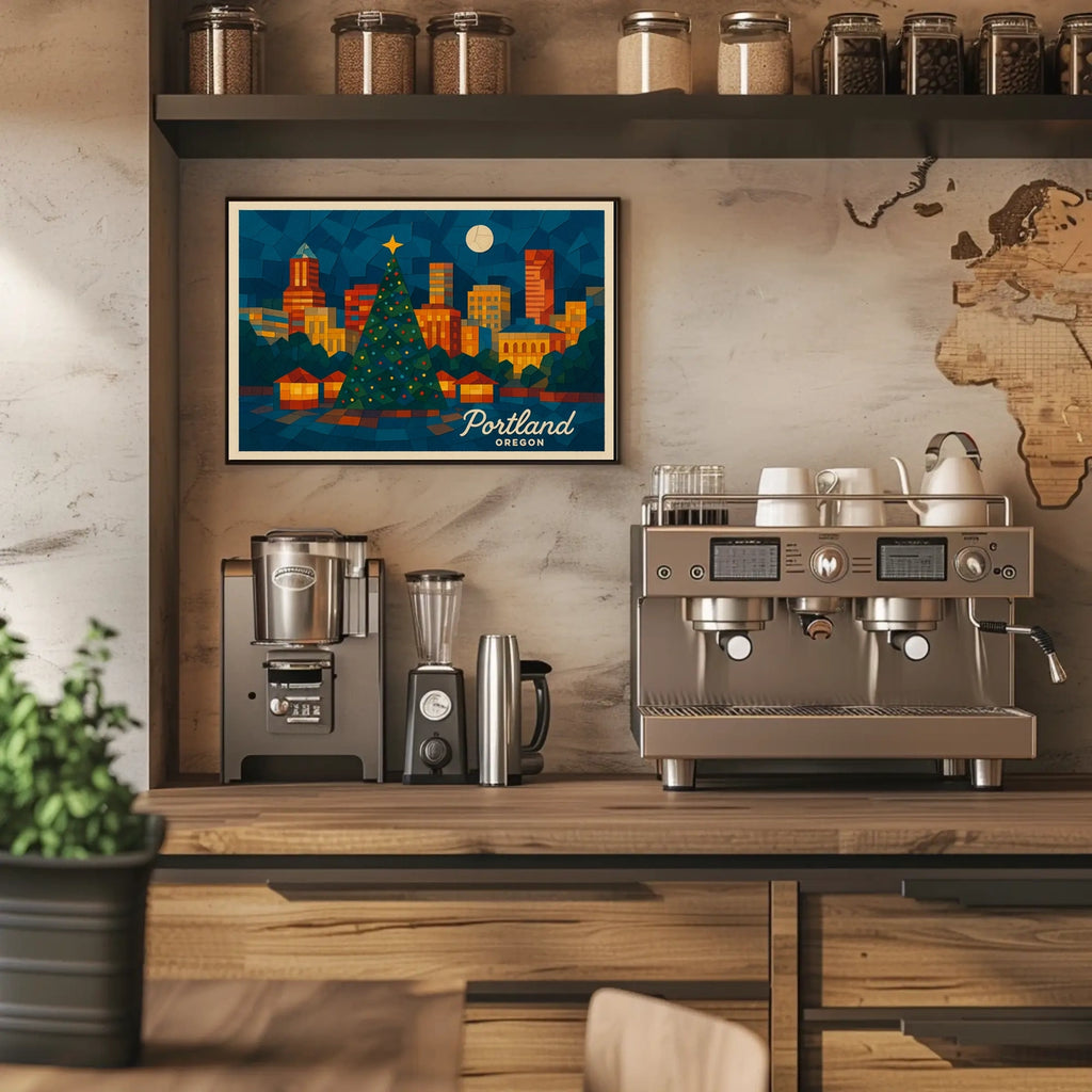 Detailed design highlighting Portland's skyline and holiday ambiance