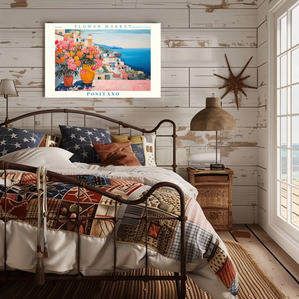 Bring the sun-drenched magic of the Amalfi Coast into your home with Positano's Vibrant Scenic View: Travel Poster from PosterGoat. This expressive, vintage-style print captures a Mediterranean terrace overflowing with colorful flower pots, whitewashed buildings and terracotta roofs cascading toward a brilliant azure sea — a perfect statement piece for coastal decor and travel-inspired interiors.