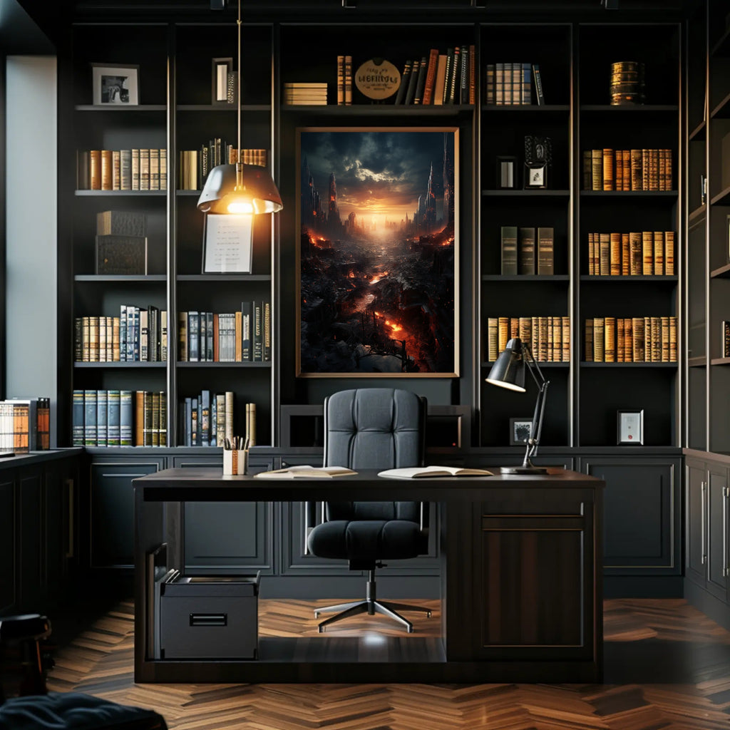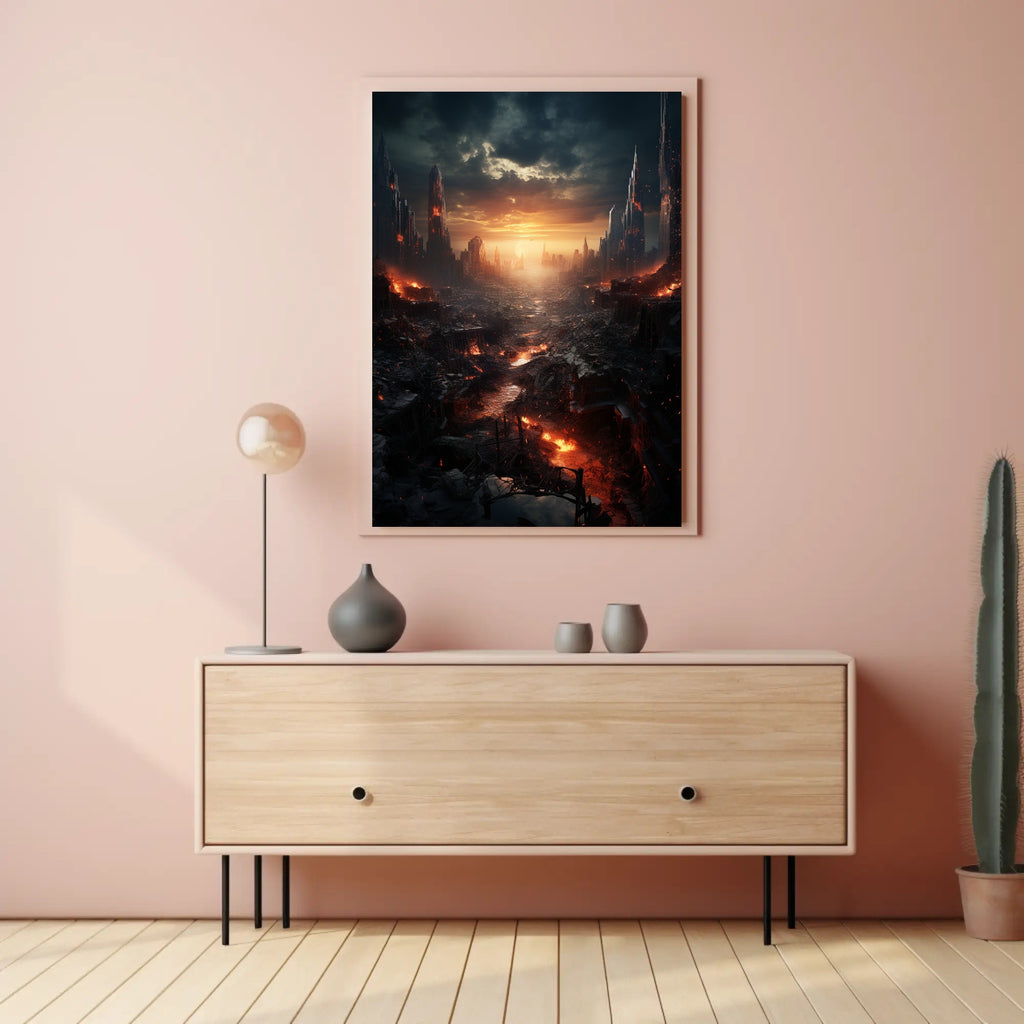 Bring dramatic storytelling to your walls with the Post-Apocalyptic Sunset Poster from PosterGoat — a cinematic poster print that fuses hauntingly beautiful sunset hues with a ravaged urban landscape. This striking piece captures a ruined cityscape split by a glowing, molten river that leads the eye to a distant, amber sun framed by brooding clouds and jagged towers.