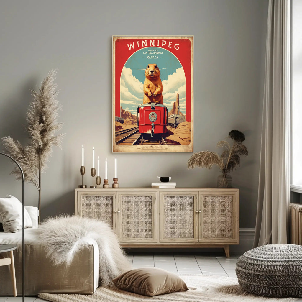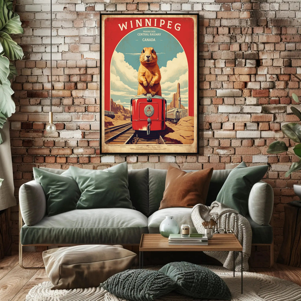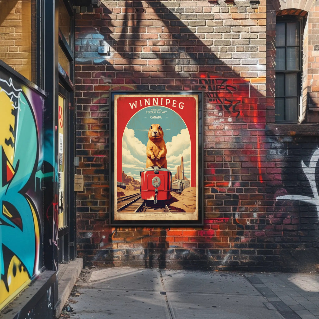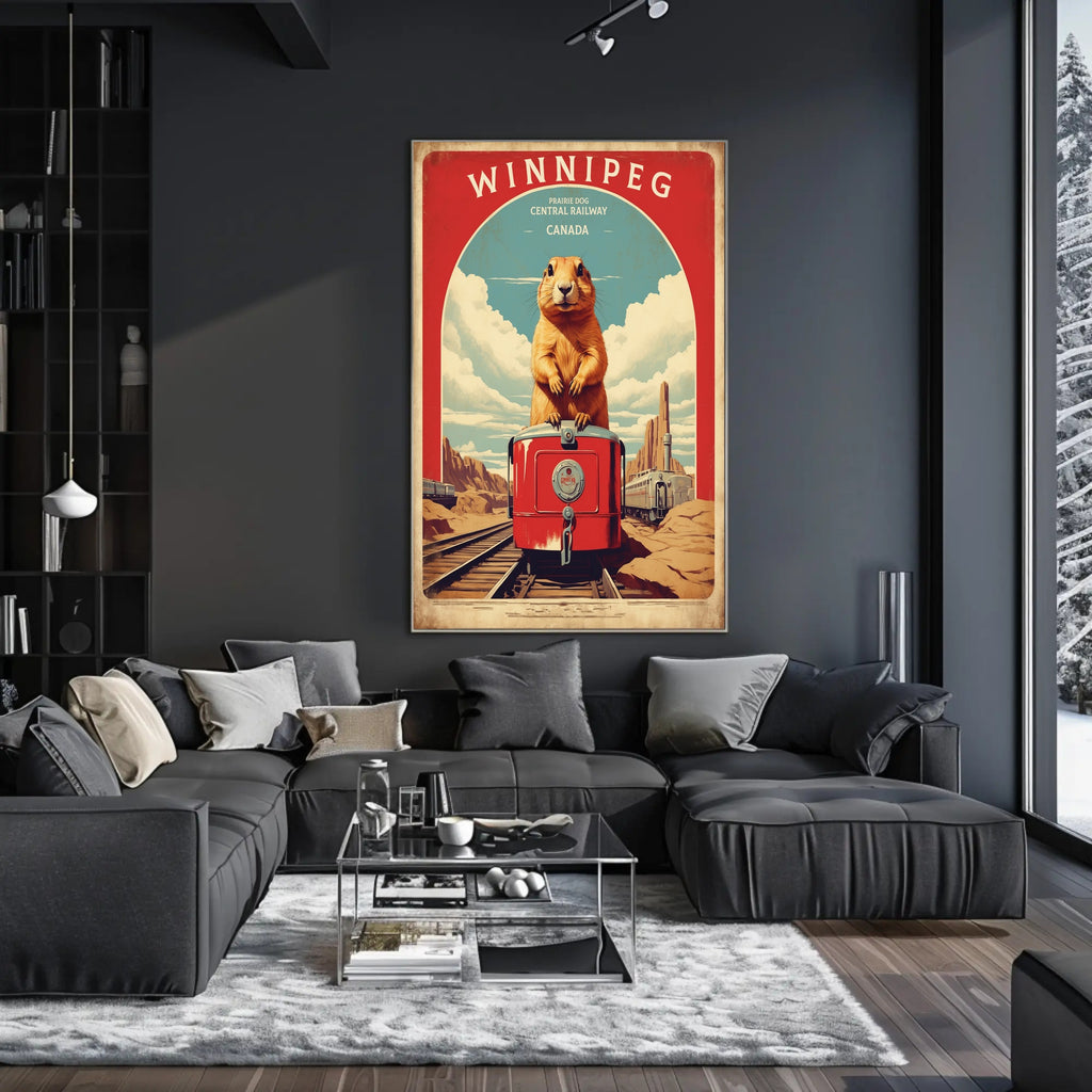 Experience the whimsical charm of this vintage poster, celebrating the historic Prairie Dog Central Railway in Winnipeg, Canada. This captivating artwork brings to life a surreal scene where a playful prairie dog sits atop a vivid red train car. Set against a rugged, desert-like Canadian landscape, the poster captures the imagination with its fluffy cloud-filled sky and nostalgic tone. Its artistic value lies in the imaginative blend of nature and history, invoking a sense of adventure and nostalgia for the golden age of railway . Perfect for any enthusiast or vintage art collector.