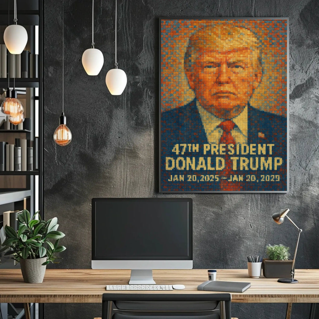 Capture leadership with a striking portrait set against a backdrop that hints at a future presidential theme. The artwork is crafted in a unique digital mosaic and cross-stitch style, creating a modern yet textured visual experience. The pixelated design adds an abstract flair, while the formal attire underscores the subject's authoritative presence. Warm tones infuse the piece with a sense of optimism and patriotism, making it an ideal addition to any space seeking to inspire bold leadership and visionary thinking.
