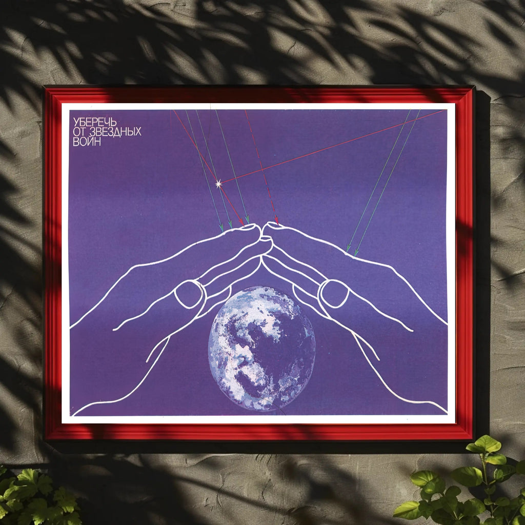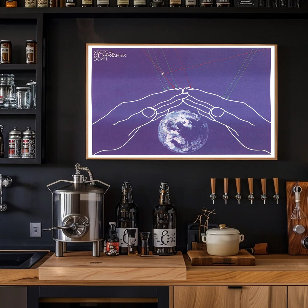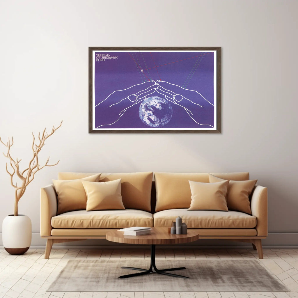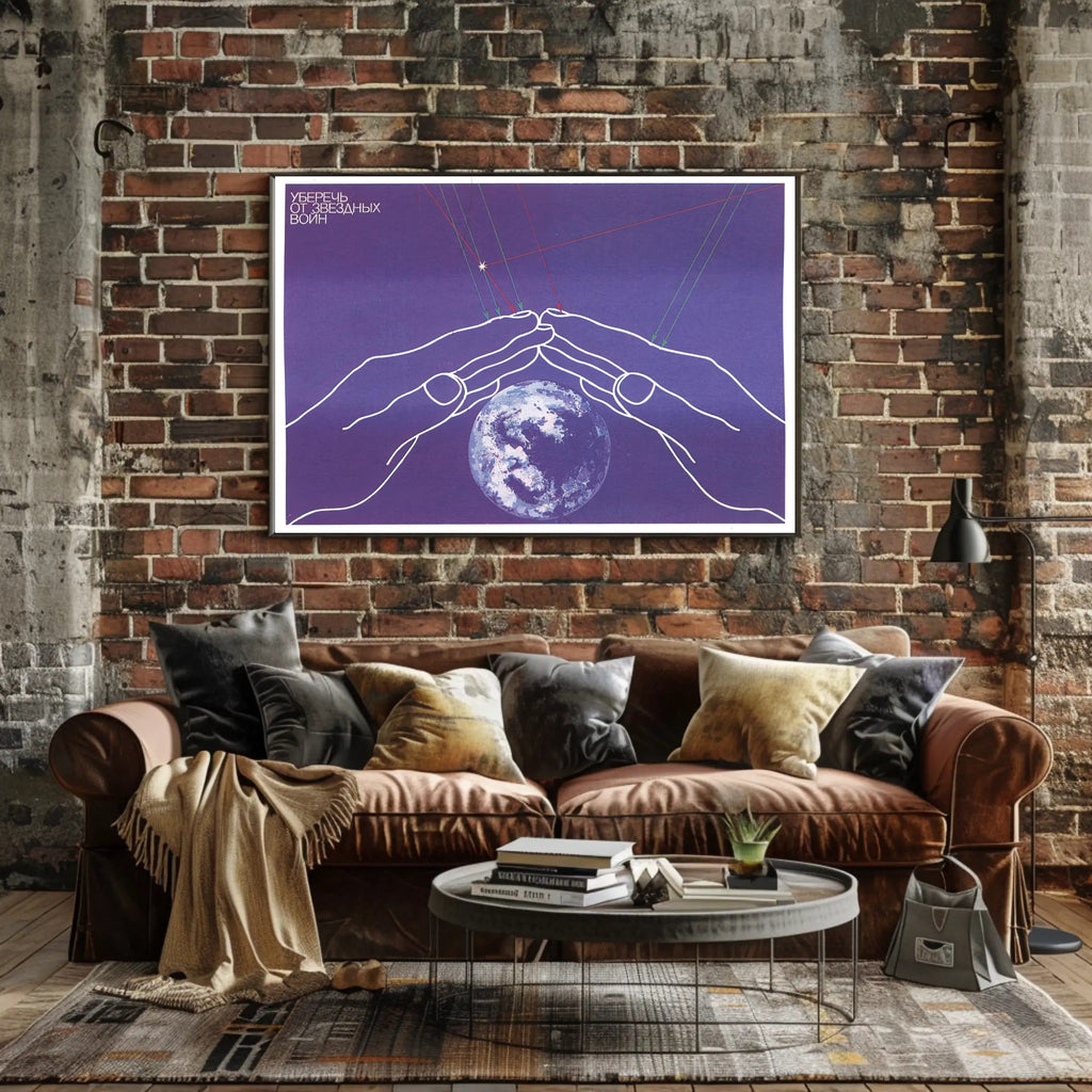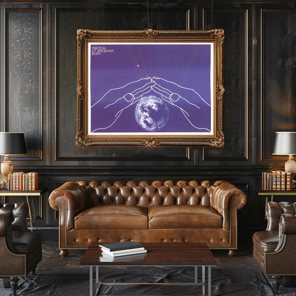 Evocative and graphic, the Protecting from Star Wars Poster from PosterGoat transforms any wall into a statement of protection and wonder. A rich purple field sets the stage for finely drawn white line-art hands that form a shelter over a textured globe, while thin vector beams and a bright starburst introduce movement and tension—an arresting piece of home decor and visual storytelling perfect for living rooms, studios, or office walls.