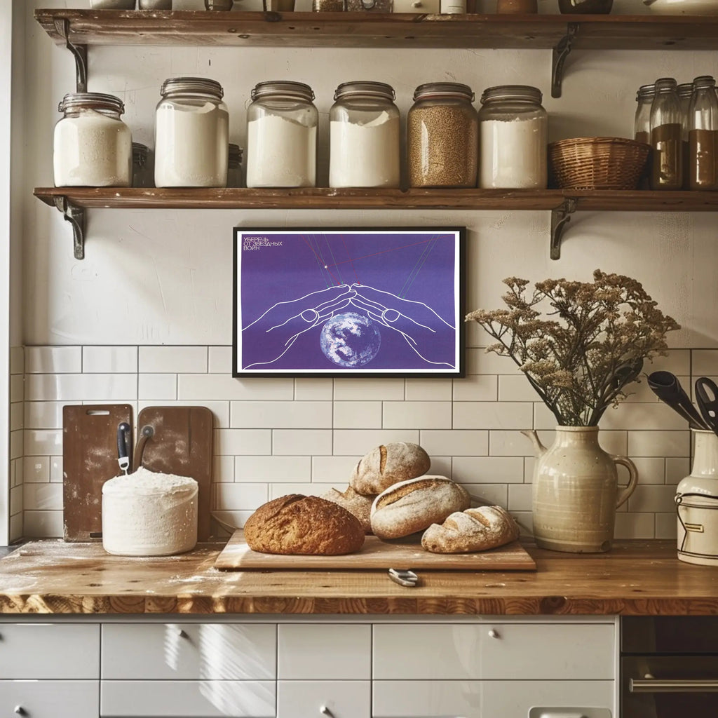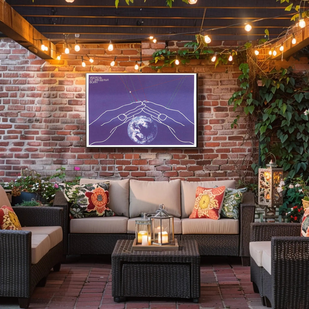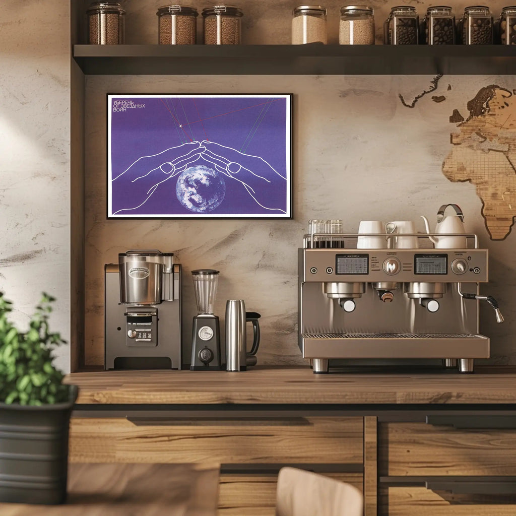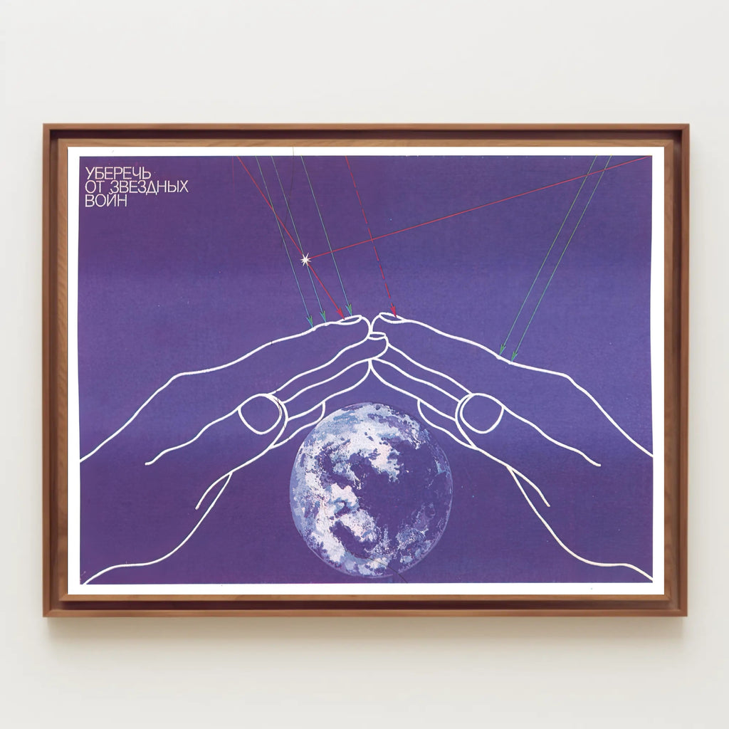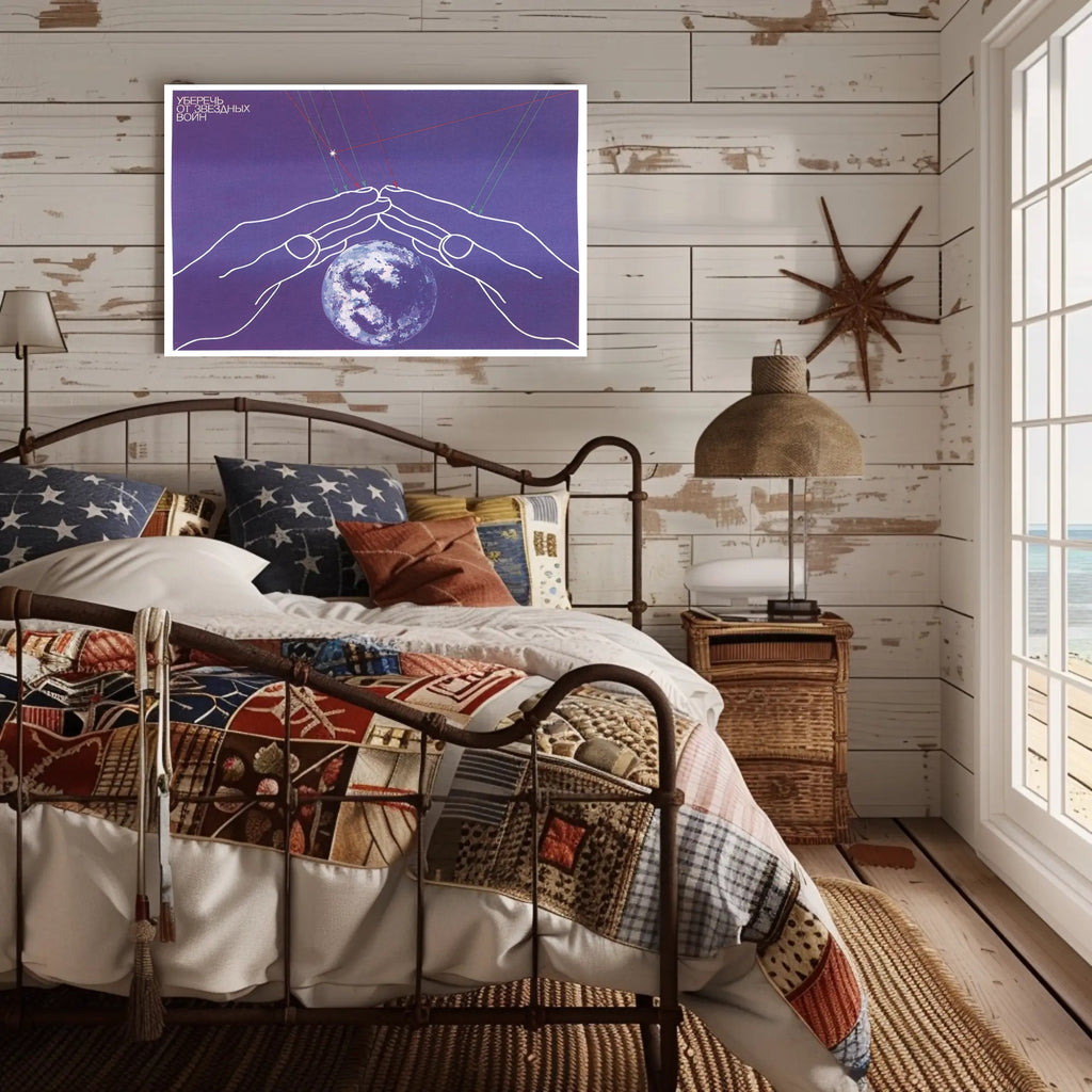 Evocative and graphic, the Protecting from Star Wars Poster from PosterGoat transforms any wall into a statement of protection and wonder. A rich purple field sets the stage for finely drawn white line-art hands that form a shelter over a textured globe, while thin vector beams and a bright starburst introduce movement and tension—an arresting piece of home decor and visual storytelling perfect for living rooms, studios, or office walls.