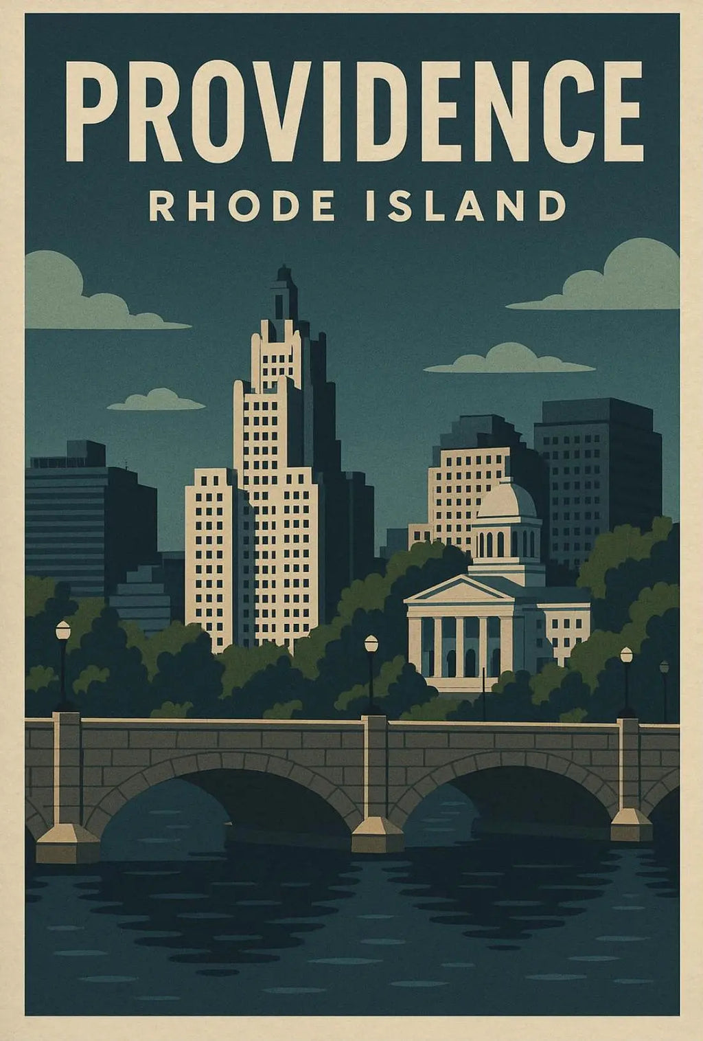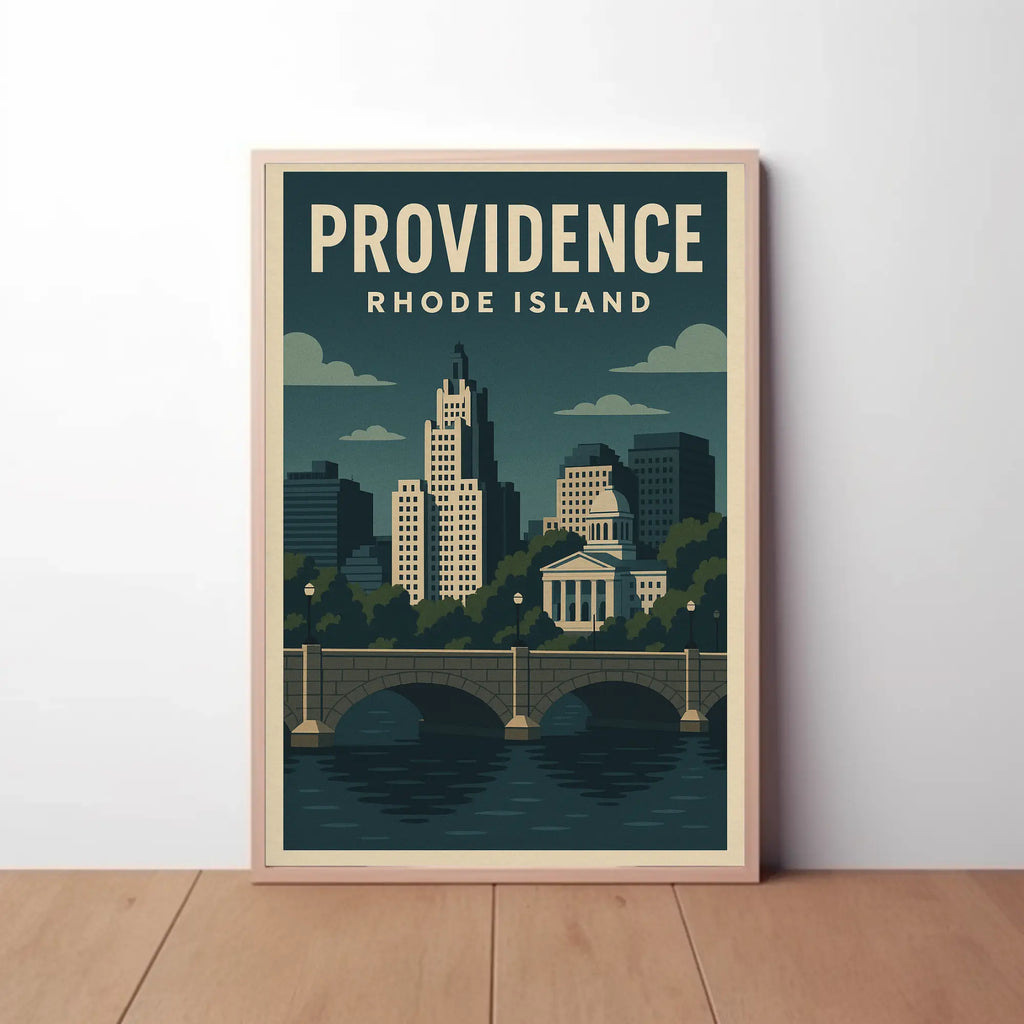 - Art & design: Crafted in a vintage Art Deco aesthetic, this poster features a stylized Providence skyline with the iconic Rhode Island State House, a stone-arched bridge and calm river reflections in a muted teal and cream palette.