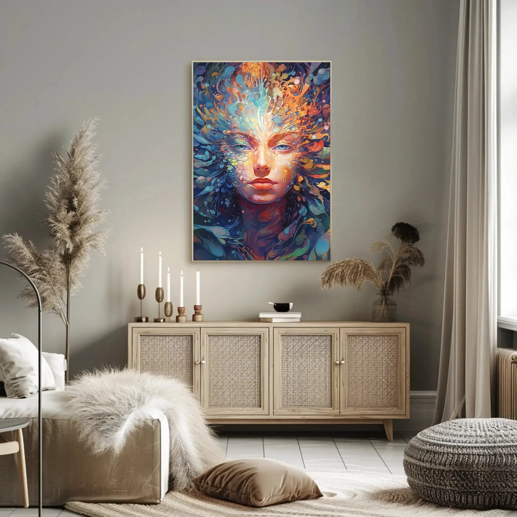 Why you'll love it: The portrait's expressive face and organic, flowing patterns create emotional resonance while the high-contrast palette energizes any room. Use it to anchor a living room, studio, office, or bedroom and watch the space come alive.