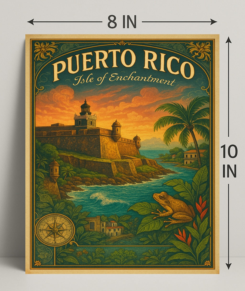 Puerto Rico Isle of Enchantment Poster Print — an evocative travel-style wall art from PosterGoat that brings the warm glow of a Caribbean sunset, historic coastal fortress, and lush tropical life into your home. This vintage-inspired poster captures Puerto Rico’s scenic charm with rich, hand-drawn detail: a dramatic seaside fort perched on rugged cliffs, swaying palms, a curious coquí frog, a classic compass motif and verdant foliage that frames a timeless island scene.