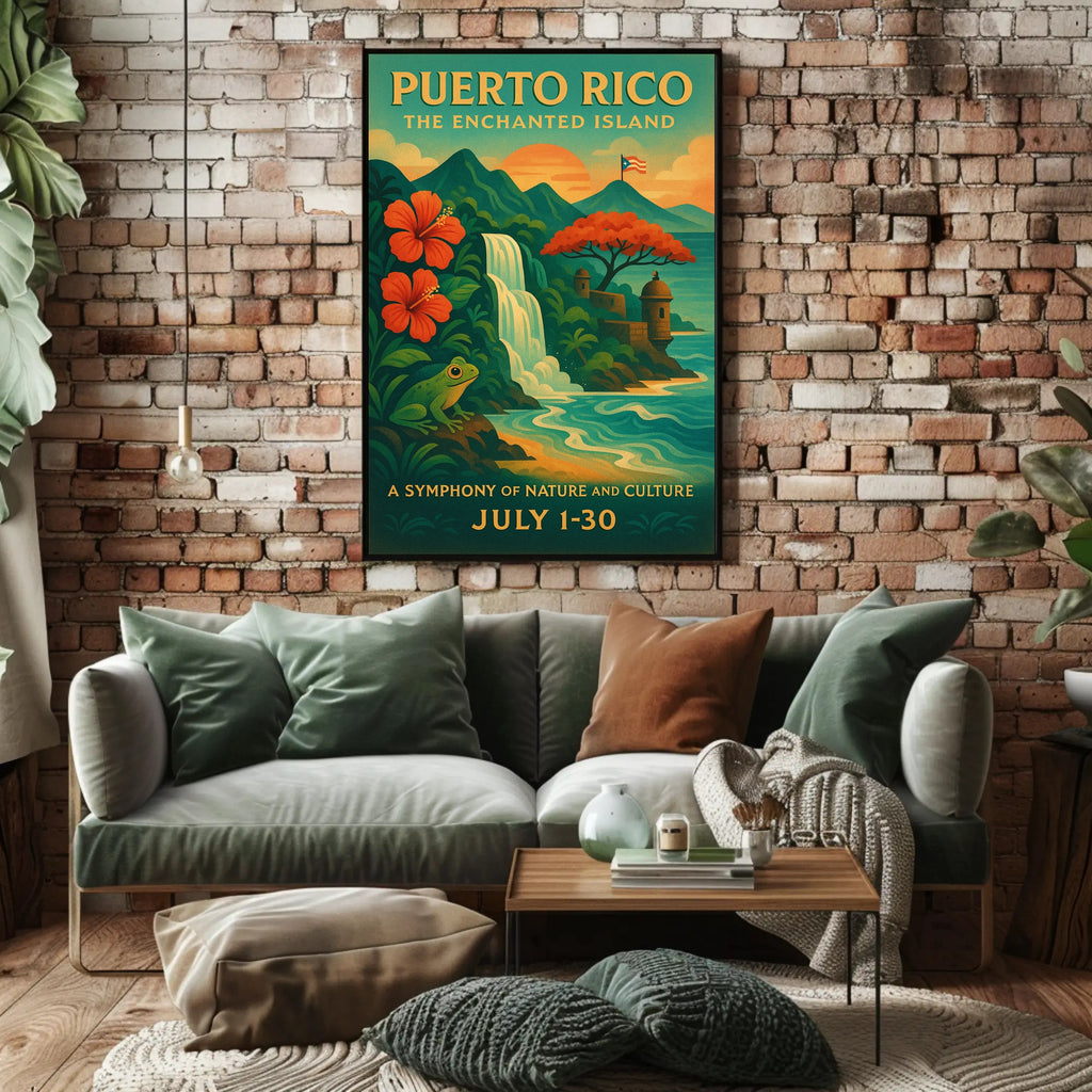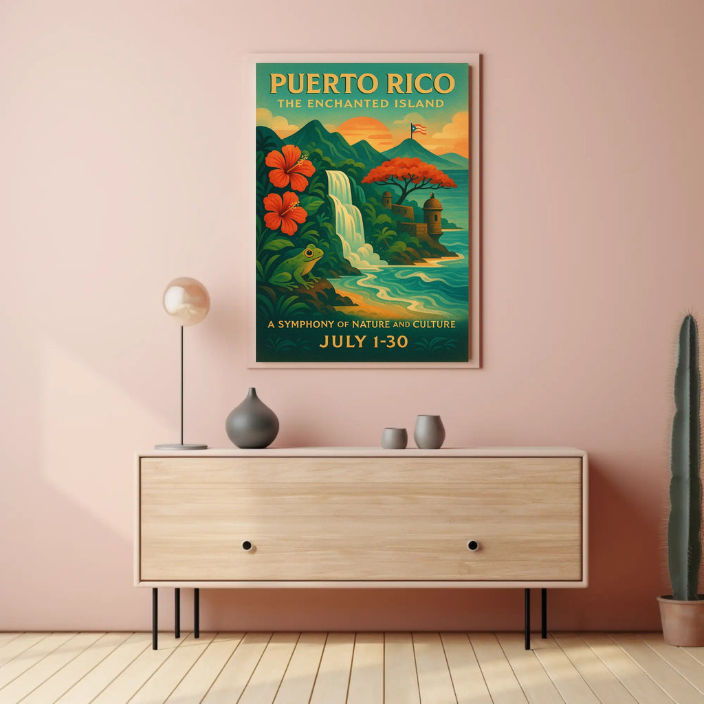 Transport your space to a sun-soaked tropical getaway with the Puerto Rico Enchanted Island Wall Art Print from PosterGoat. This vibrant, vintage-inspired poster captures the island's magic in a minimalist, scenic composition — lush mountains, cascading waterfalls, a sentinel fort on the shore, bright hibiscus blooms, and the beloved coquí frog beneath a warm, setting sun.