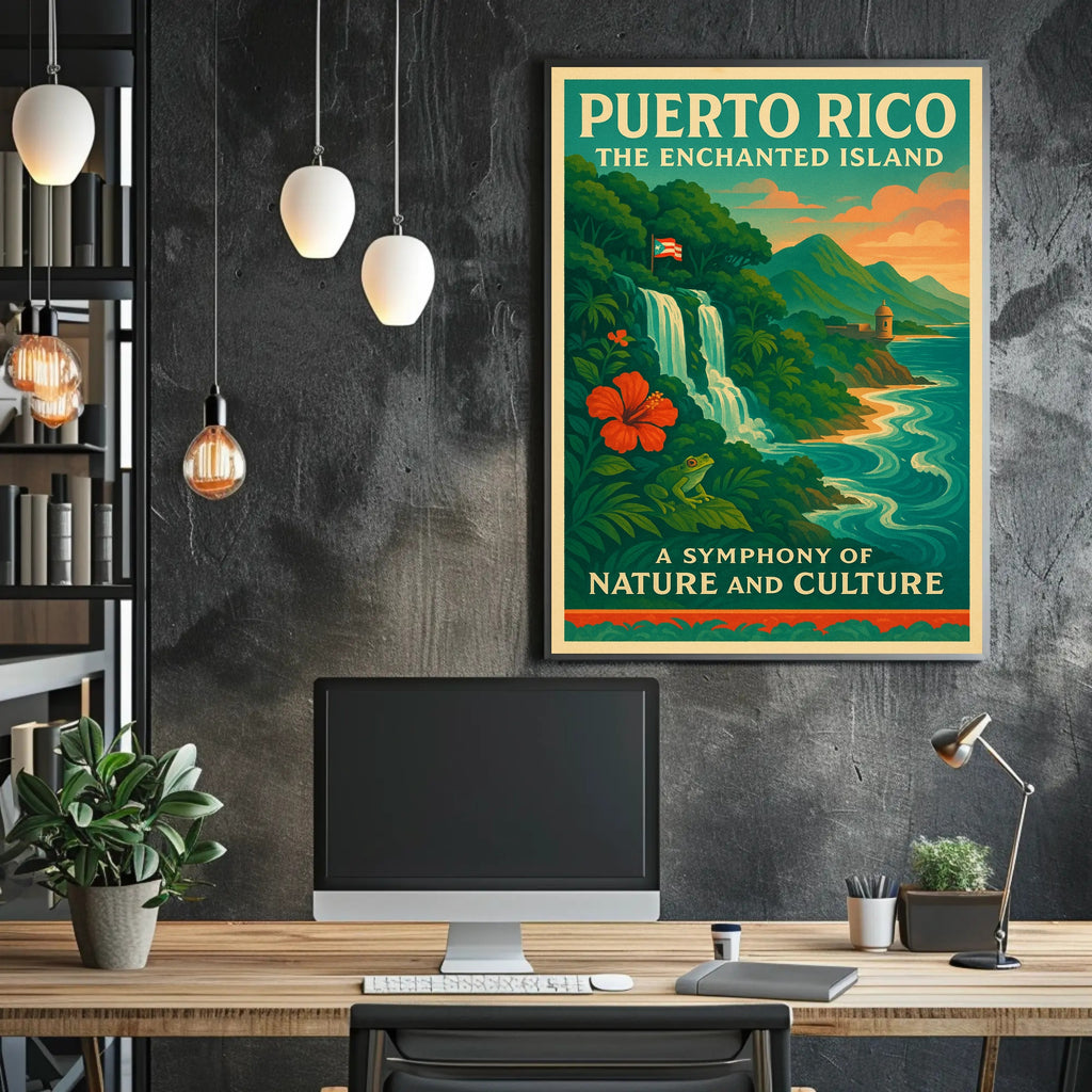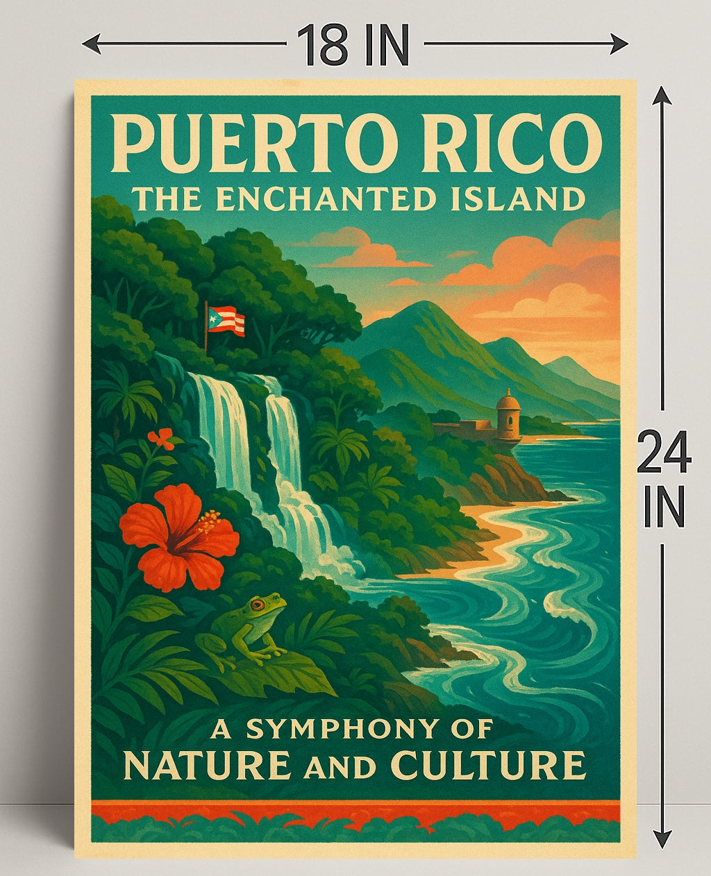 Bring the lush spirit of Puerto Rico into your home with the Puerto Rico Enchanted Island Print Wall Art by PosterGoat — a vintage-inspired poster that celebrates the island's vibrant scenery and rich culture in a single, striking image.