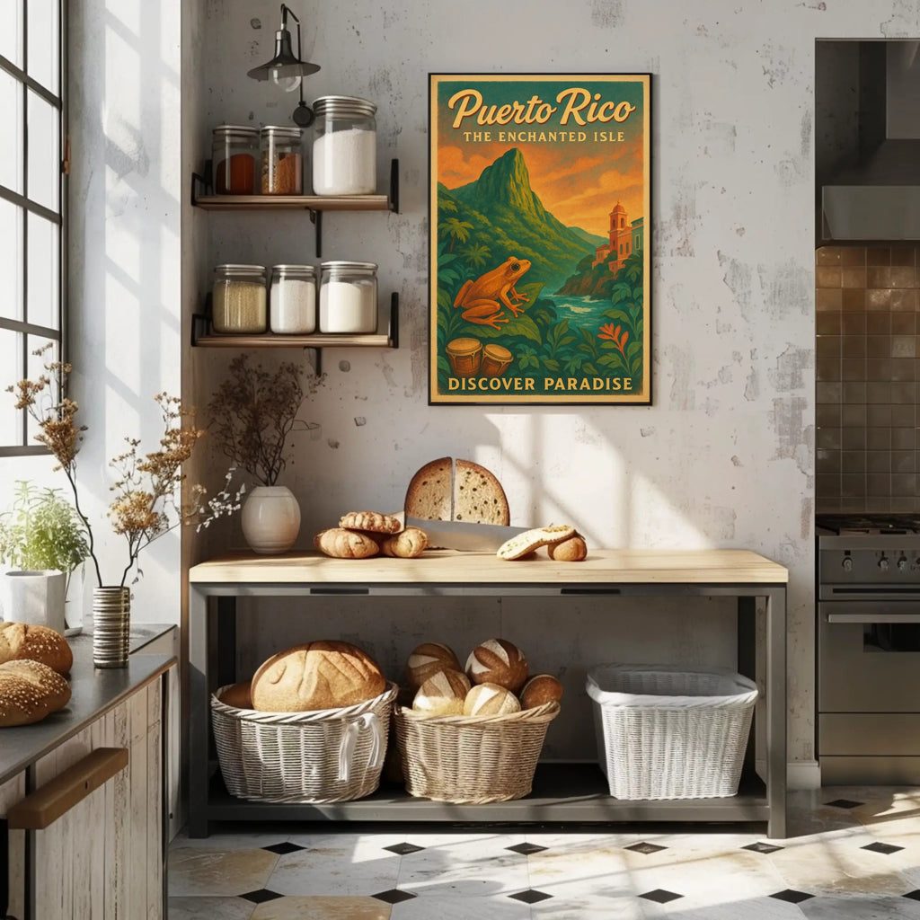 Bring home the magic of the Caribbean. The "Puerto Rico — The Enchanted Isle" wall art from PosterGoat transforms any room with its vintage-travel poster aesthetic: warm sunset hues, a misty mountain peak, idyllic coastal village architecture, lush tropical foliage and a charming tree frog perched above traditional conga drums. This scenic poster captures the island's soulful character in a minimalist, artful composition that fits modern and classic interiors alike.