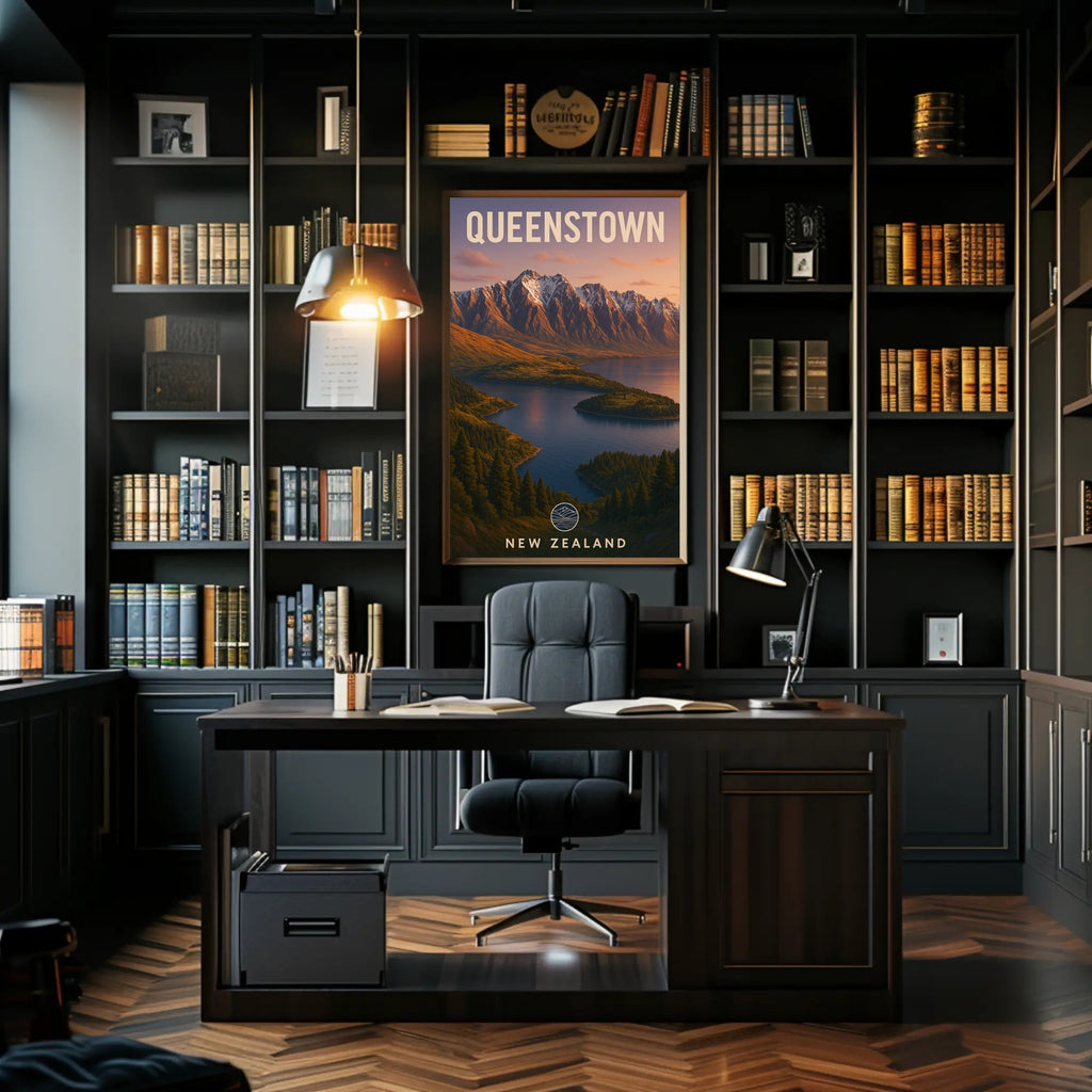 Bring the dramatic alpine beauty of Queenstown, New Zealand into your home with this PosterGoat art print. Rich sunset tones, snow-capped jagged peaks, winding lake inlets and forested islands combine in a minimalist travel-poster style that feels both vintage and contemporary—perfect for living rooms, offices, or adventure-inspired spaces.