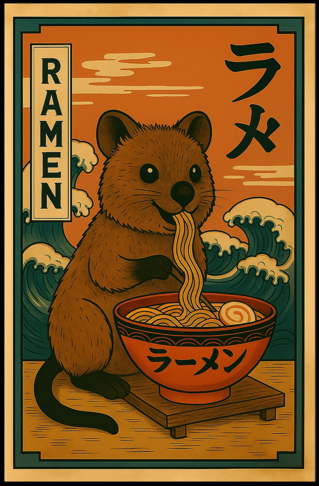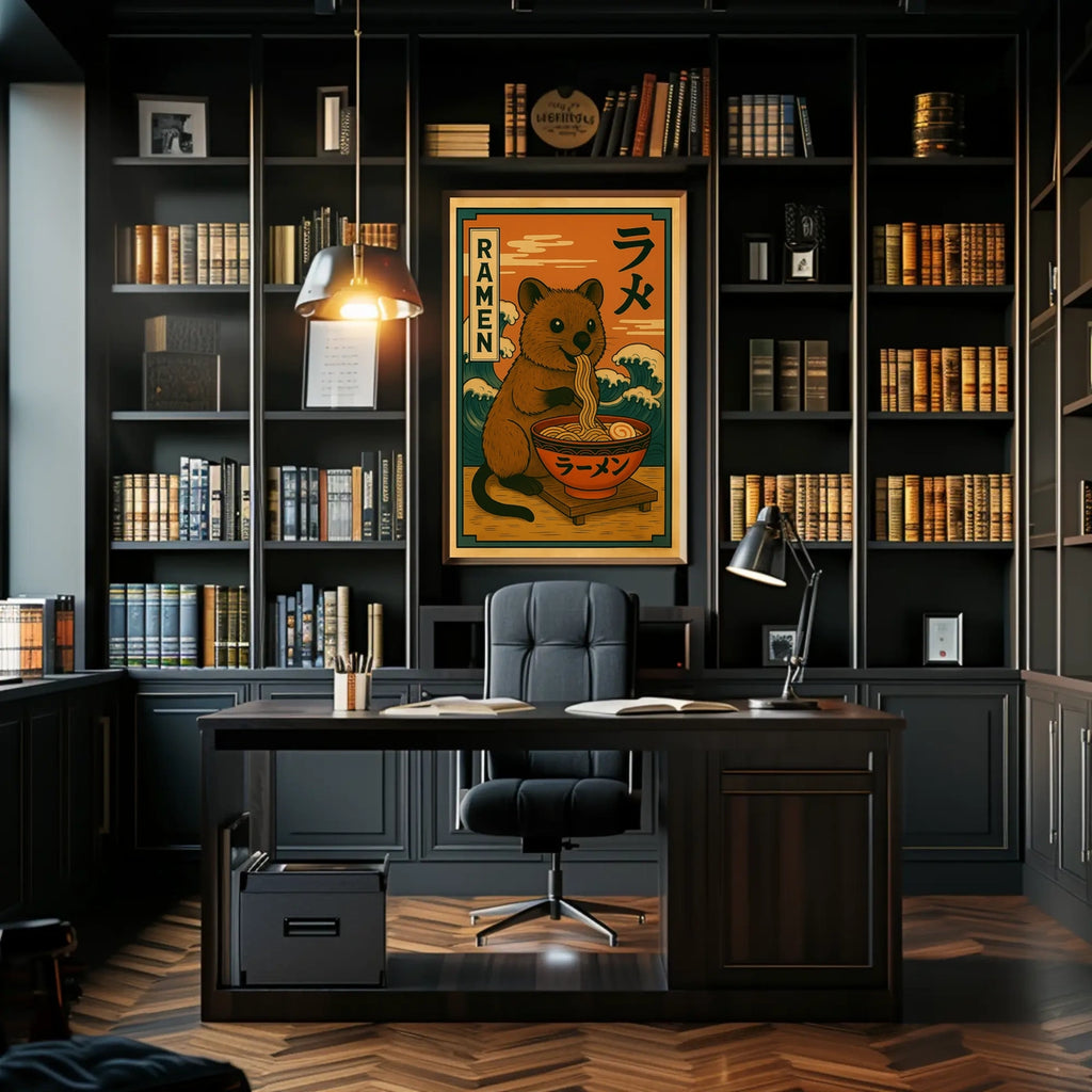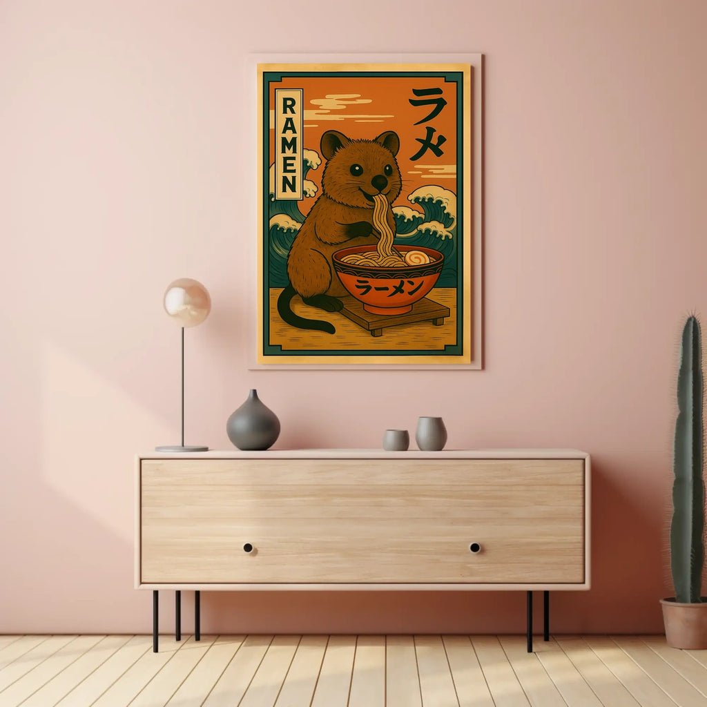 Elevate your wall with the Quokka Ramen Delight Poster. This art print blends whimsical quokka charm with ramen-inspired scenery, creating a playful yet sophisticated focal point for any room. Designed for decor lovers and wanderlust spirits, it adds character to living spaces, bedrooms, and studios alike. Printed on premium stock with vibrant, fade-resistant inks, this poster delivers crisp detail and a cheerful nod to travel, comfort, and curiosity.