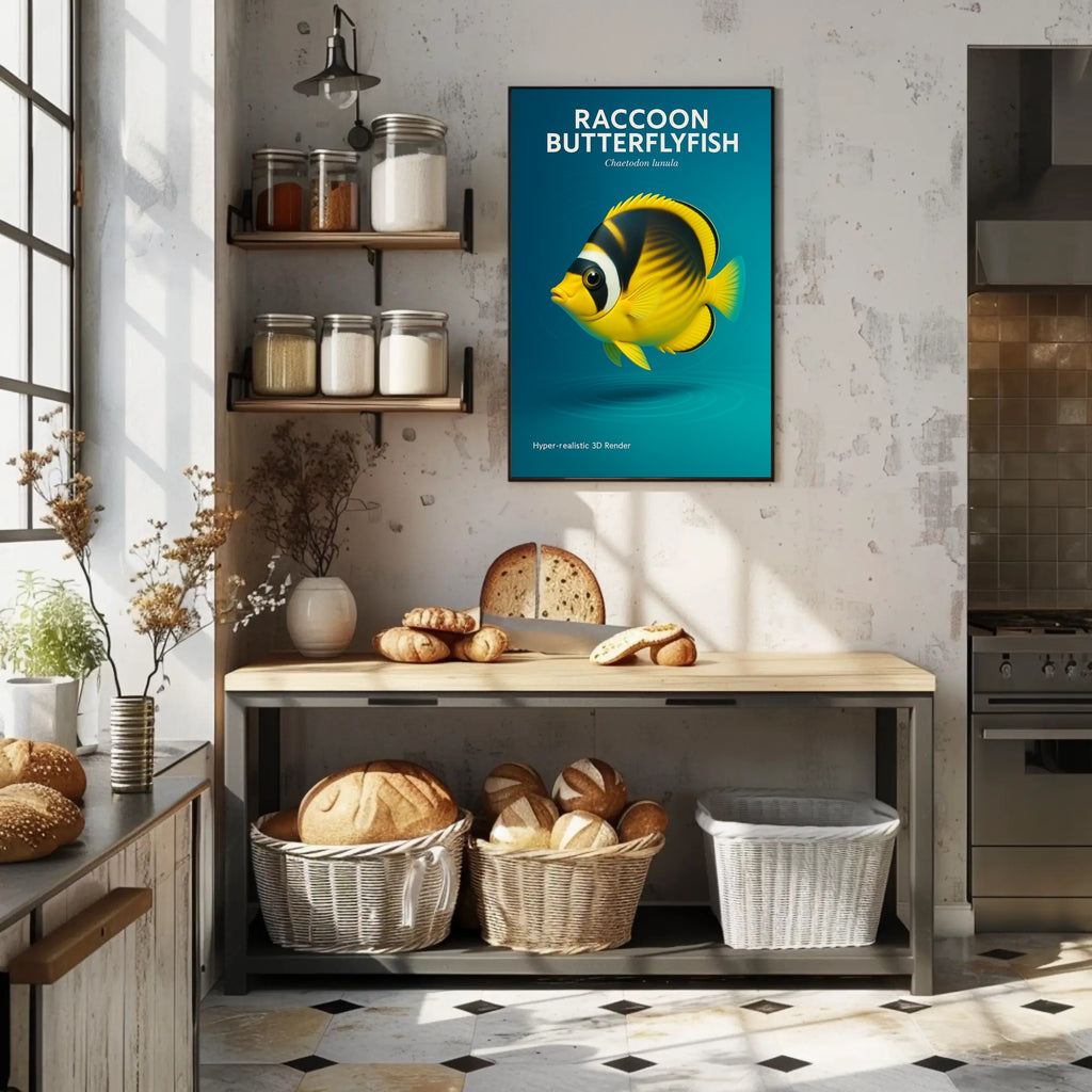 Bring the ocean into your home with the Raccoon Butterflyfish Hyper-realistic 3D Render Poster from PosterGoat — a striking piece of wall art that pairs hyper-realistic 3D rendering with minimalist design to create a bold focal point for living rooms, offices, nurseries, or coastal-themed spaces.