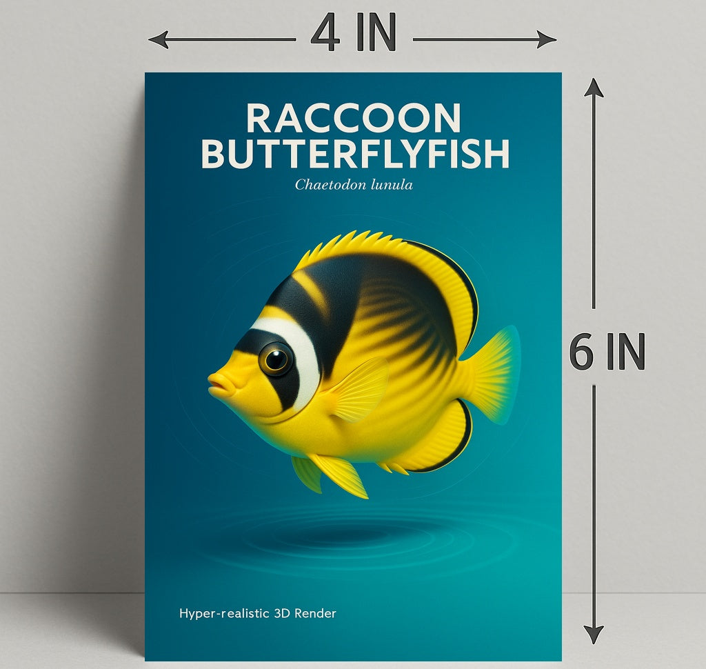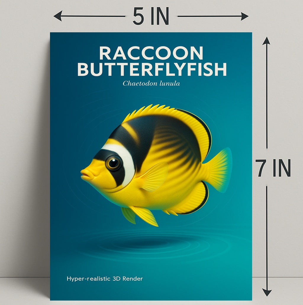 - Eye-catching realism: A vivid, lifelike render of the raccoon butterflyfish floats against a deep teal gradient, its glossy eye, textured scales and bright yellow fins rendered in exquisite detail to pop from any wall.