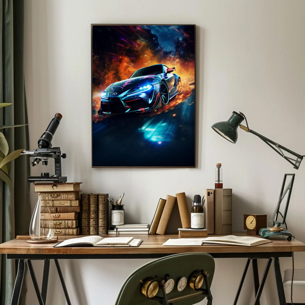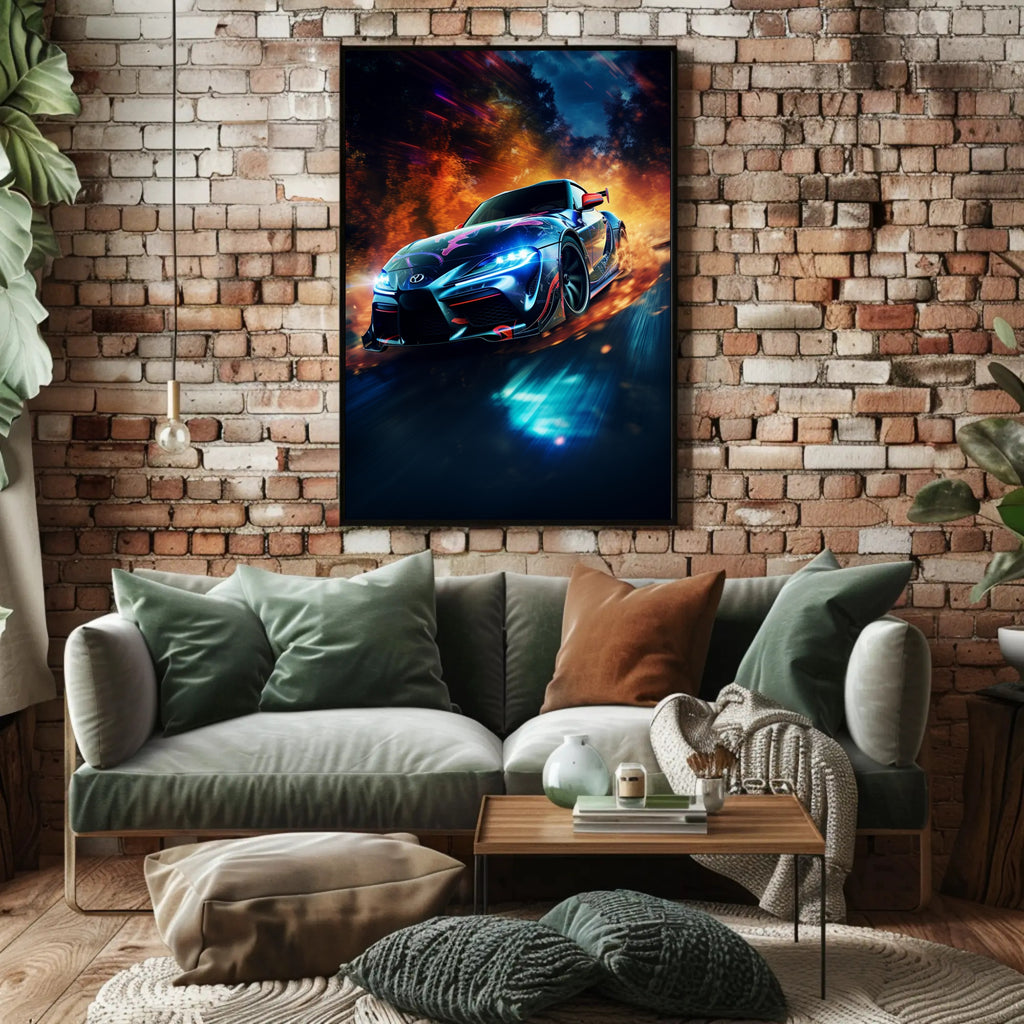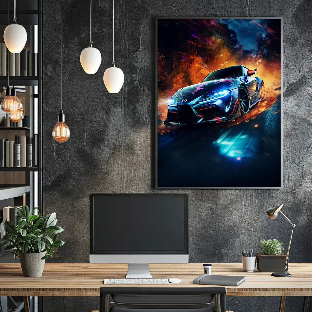Printed on premium archival paper with vivid inks, this poster resists fading and preserves fine detail so the car’s luminous headlights, dynamic reflections, and textured flames remain dramatic for years. Framed or unframed, Racing Inferno becomes an instant focal point that complements contemporary and automotive-themed decor.