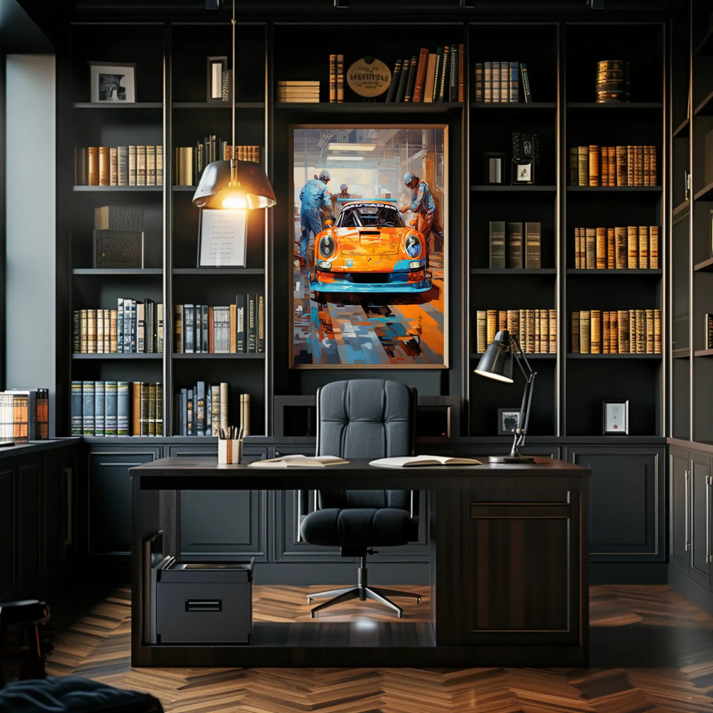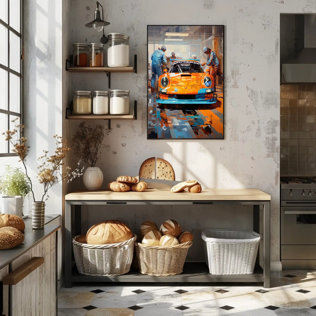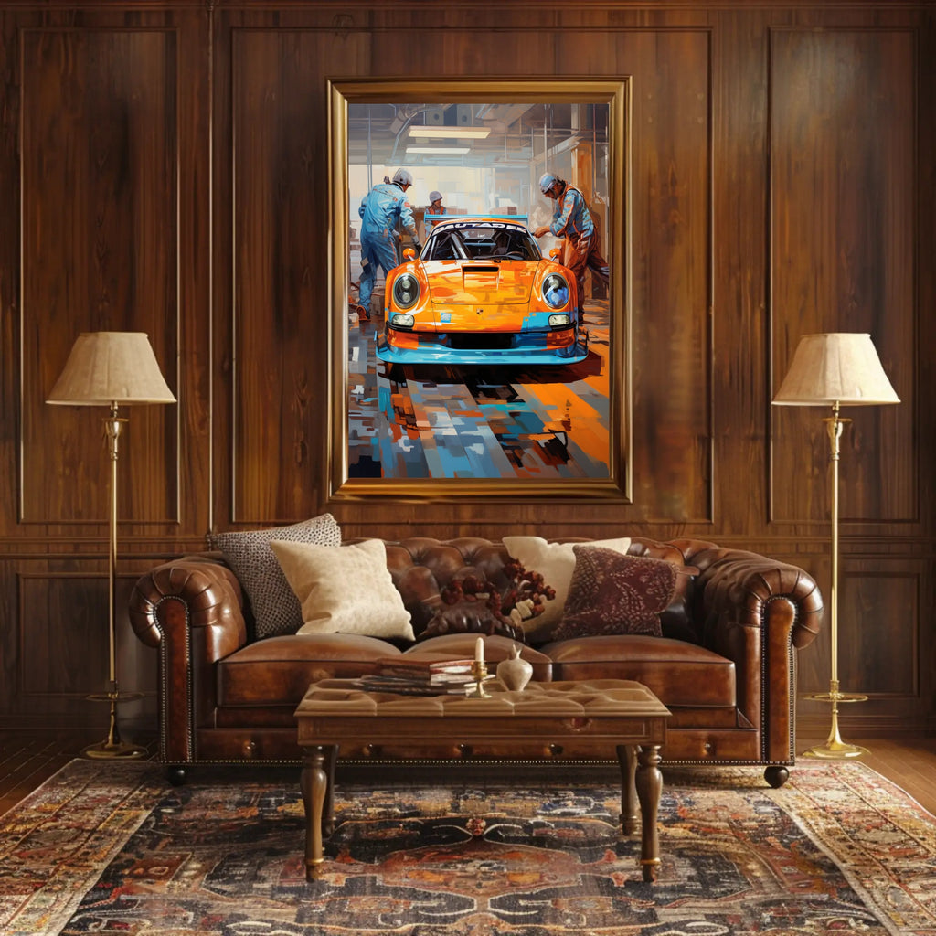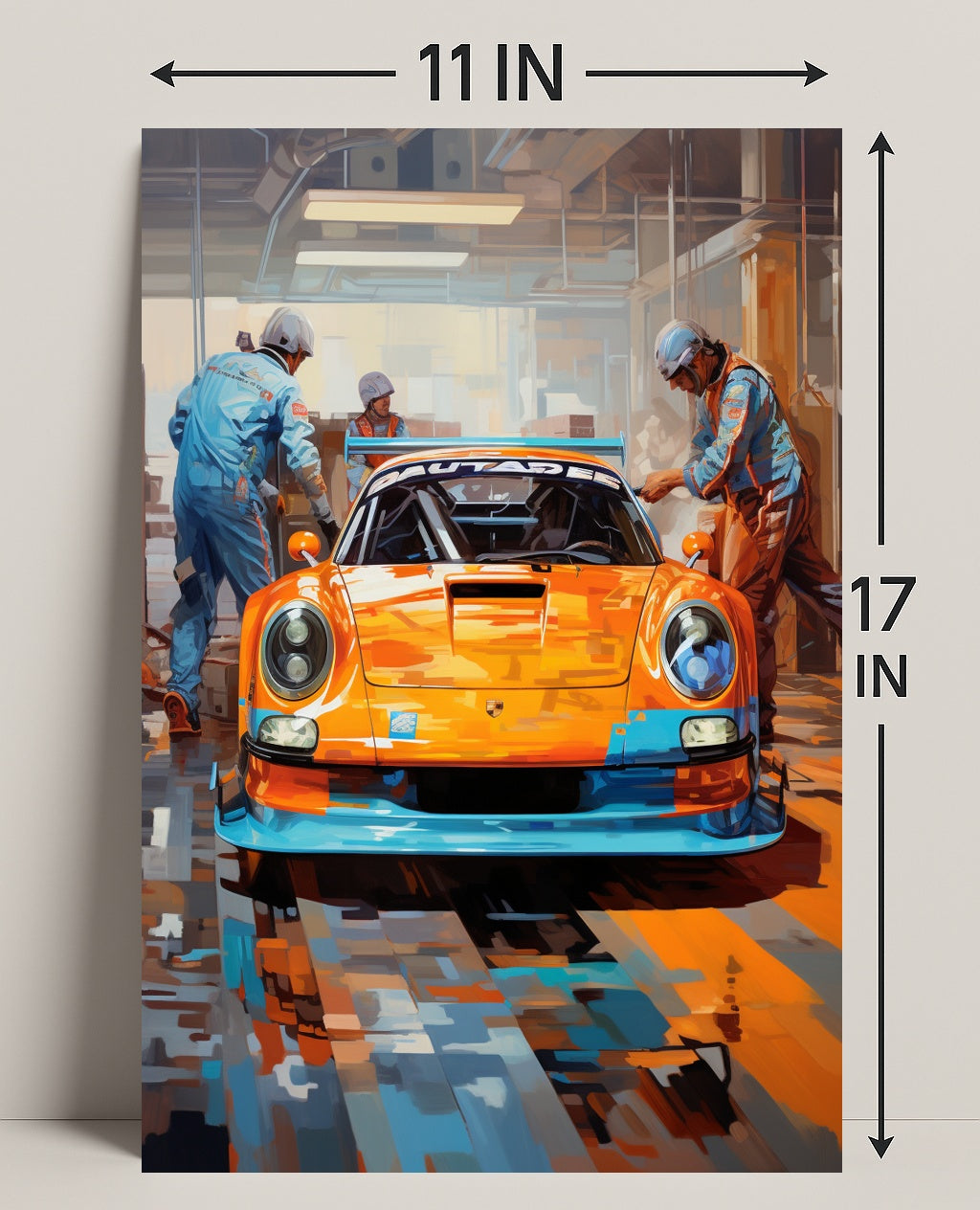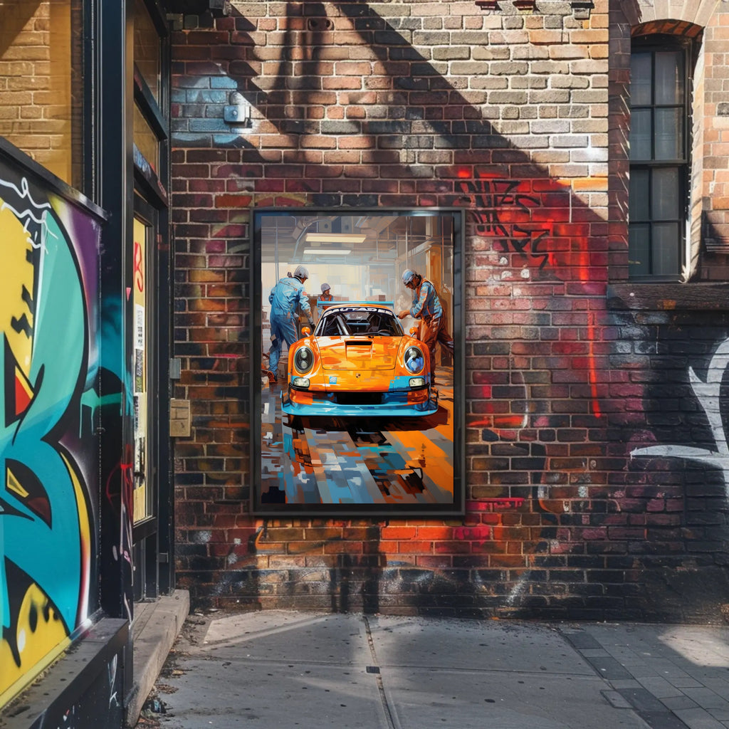 Bring the roar of the track into your home with the Racing Pit Stop Poster from PosterGoat — a bold pop-art tribute to speed, teamwork, and high-performance design. This vivid print centers on a gleaming race car in striking orange and blue tones, flanked by focused pit crew members under industrial garage lighting — an image that jumps off the wall and energizes any room.