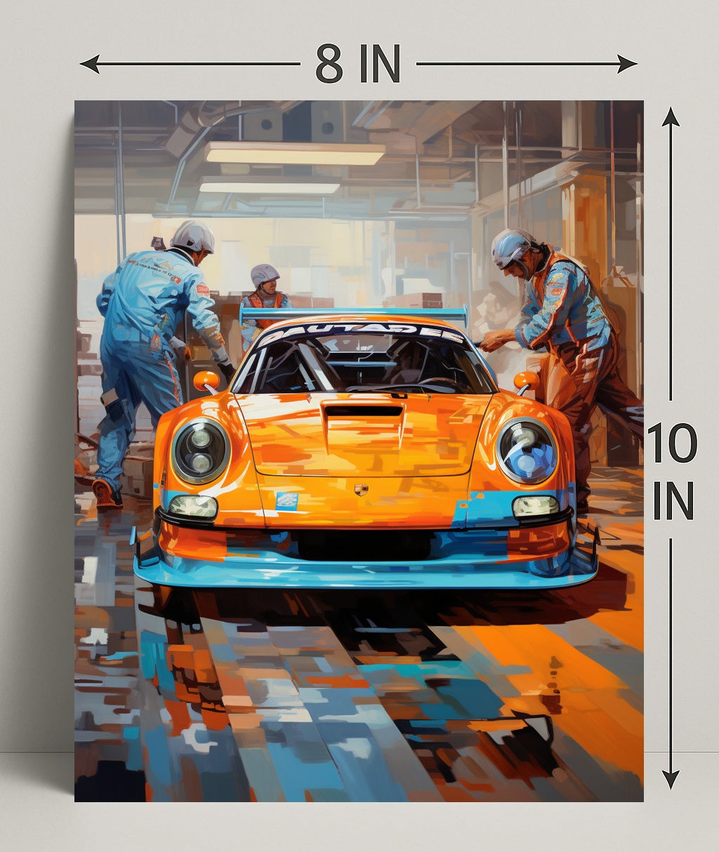 - Captures racing atmosphere: The composition highlights the car’s aerodynamic lines, reflective floor patterns, and the intense, hands-on action of a pit stop — perfect for racing fans and automotive art collectors.